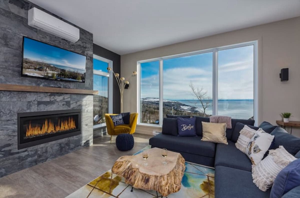 CITQ # 308712 Uživajte u izuzetnom pogledu na rijeku i planine u toplom i udobnom okruženju nakon napornog dana ili samo da se opustite. OD KUĆE, imate pristup stazama za motorne sanke. Postoji pješačka staza duga 8 km s pogledom i prelijepim vodopadima. Odlična lokacija za uživanje u svim okolnim aktivnostima u Čarlvoiku. PARKING Stanica za punjenje 10 USD/3 do 7 dana i 20 USD preko 7 dana