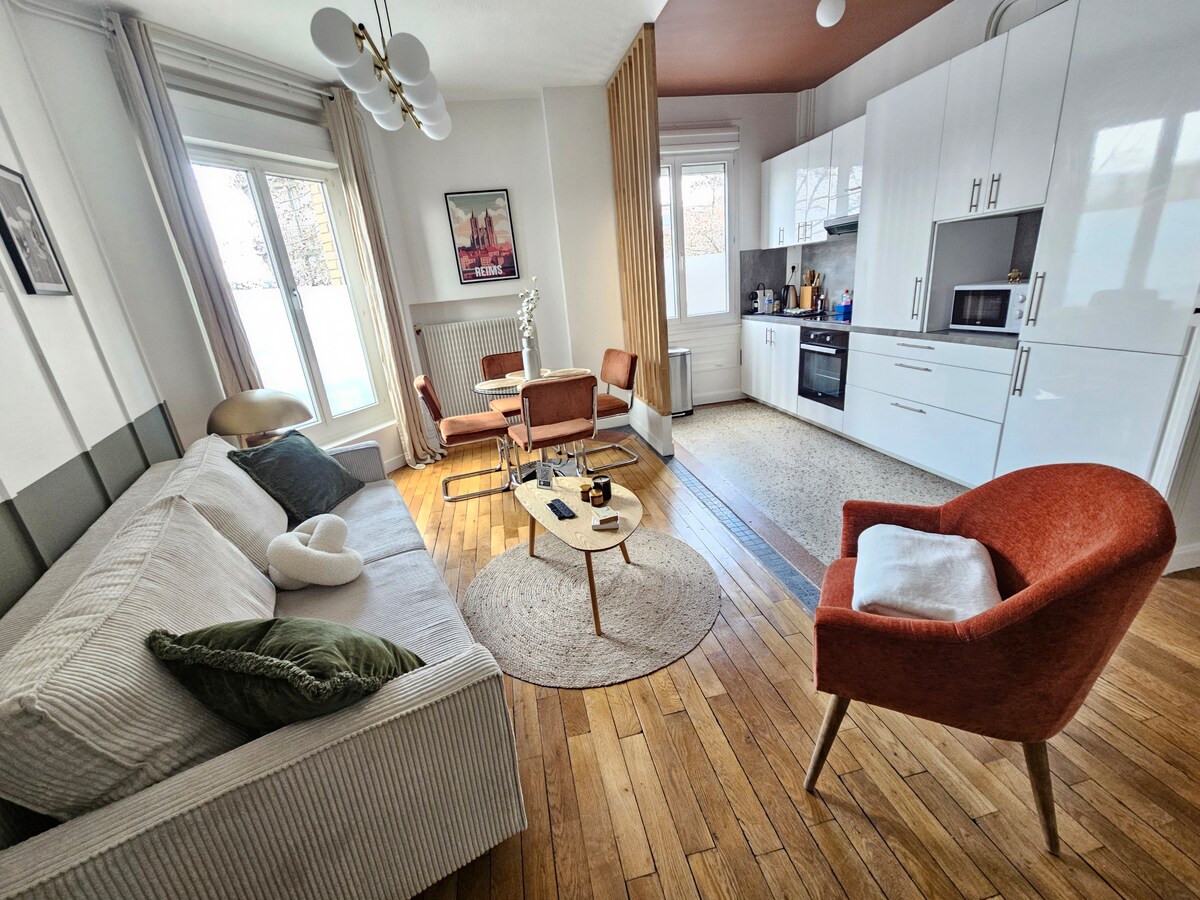 Otkrijte ovaj prelijepi stan od 50 m2 „le Clos Grandval”, dizajniran kao hotelski apartman i uživajte u prelijepoj privatnoj terasi od 10 m2 koja se nalazi manje od 15 minuta hoda od katedrale u Remsu i prestižnih kuća za šampanjac (Taittinger, Pommery, Mum..). Stan, potpuno renoviran, nudi svu udobnost koja vam je potrebna, uključujući porodice koje putuju sa bebom ili djetetom. Doživite jedinstven i autentičan doživljaj usred grada Sacres!