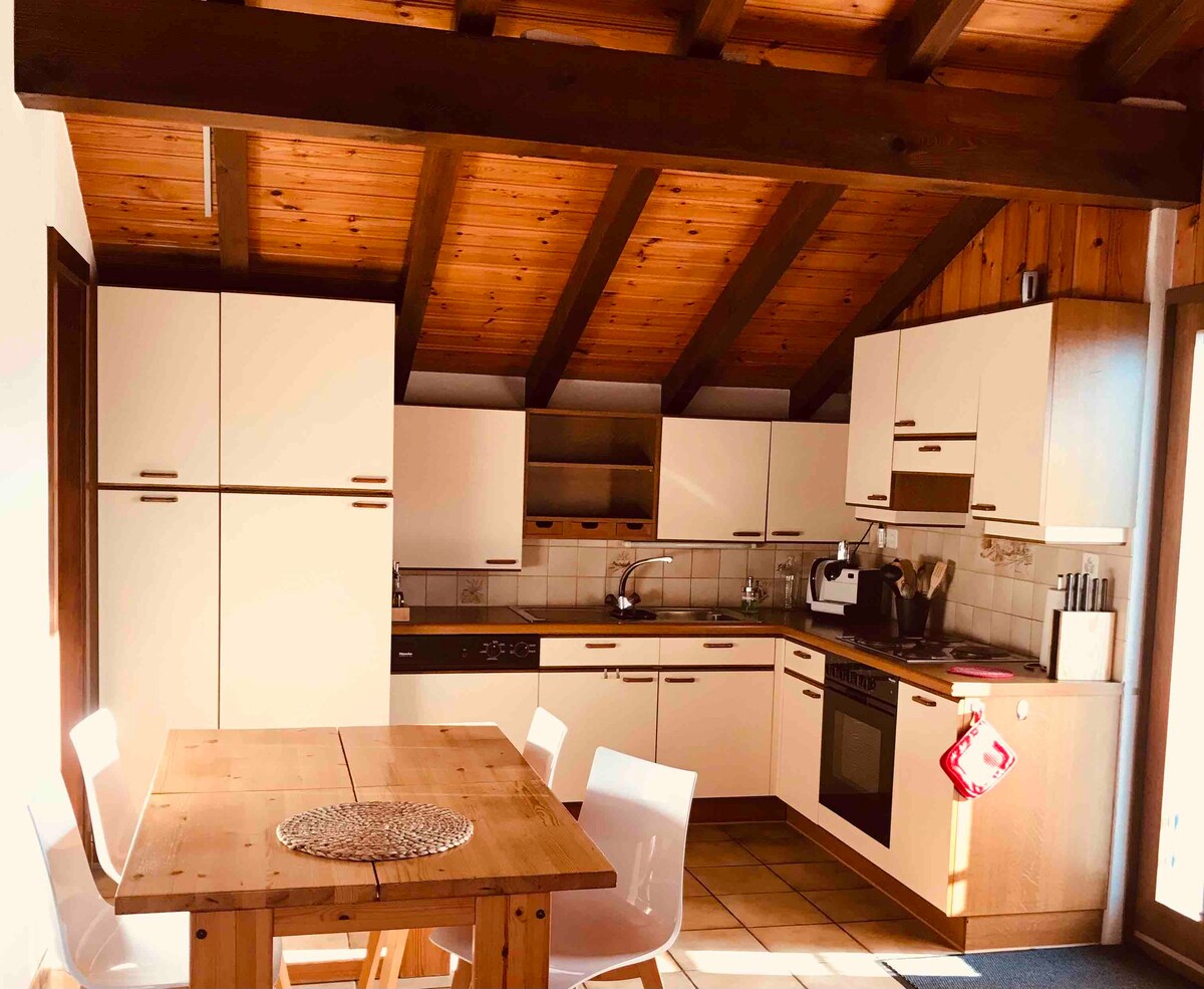 U švajcarskim Alpima, 30 minuta od glavnih skijališta, naći ćete stan od 2,5 sobe u našoj porodičnoj vili. Prekrasan pogled na planine/Matterhorn i selo, u blizini vinograda. Mirno. Uživajte u besplatnom đakuziju sa naše strane porodične bašte. Privatni stan se sastoji od 1 zasebne spavaće sobe, dnevne sobe, otvorene kuhinje sa prozorom na terasi (za ekskluzivnu upotrebu za vas), kauča na razvlačenje. TV, Wi-Fi. Toalet tuš, kolona za pranje veša.