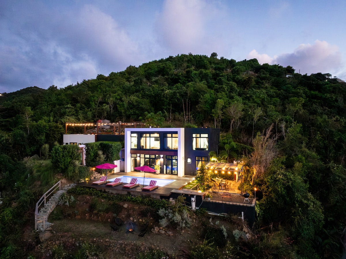 Escape to Sunrise Villas by Stacie, a private tropical mountaintop retreat in St. Thomas. Uživajte u panoramskom pogledu na okean, grijanom bazenu s terasom za sunčanje Baja, mlaznicama i svjetlima, kao i elegantnom boravku u zatvorenom prostoru s kliznim vratima od 6 metara, gurmanskom kuhinjom, barom i kaminima. Sa generatorom za cijeli dom, udobnost je zagarantovana. Savršeno za parove, porodice ili prijatelje – rezervišite vilu pored za najviše 6 dodatnih gostiju.