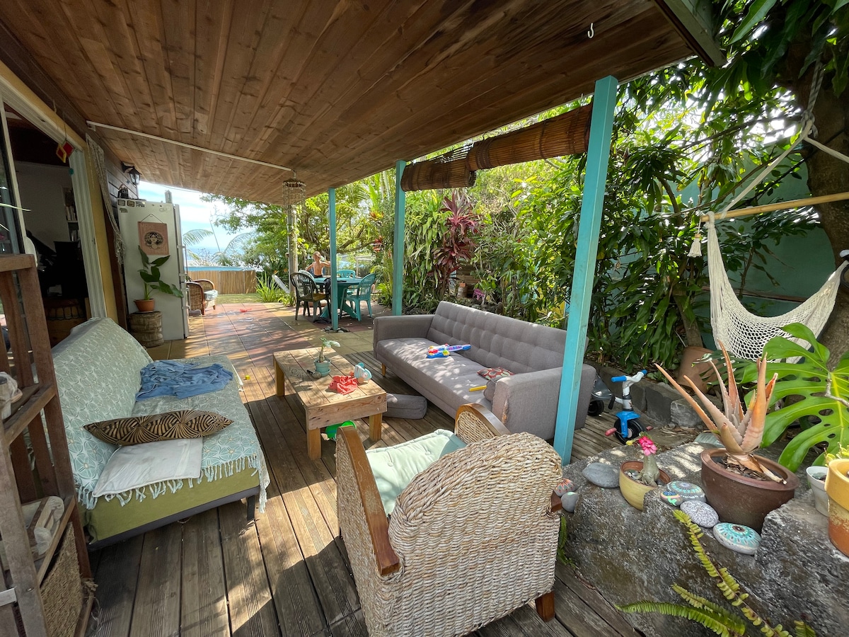 Velika kuća prijatna za boravak - pogled na more. U blizini plaže Grand Anse i bazena Manapany, sela Petite-île, rute des laves i kaskade de Langevin. 3 spavaće sobe. Prijatni spoljni prostori:velika šumovita bašta, pogled na more, terasa, viseće ležaljke, dnevna soba na otvorenom. Bezbedan parking. Savršeno za parove, solo putnike i porodice (sa decom).