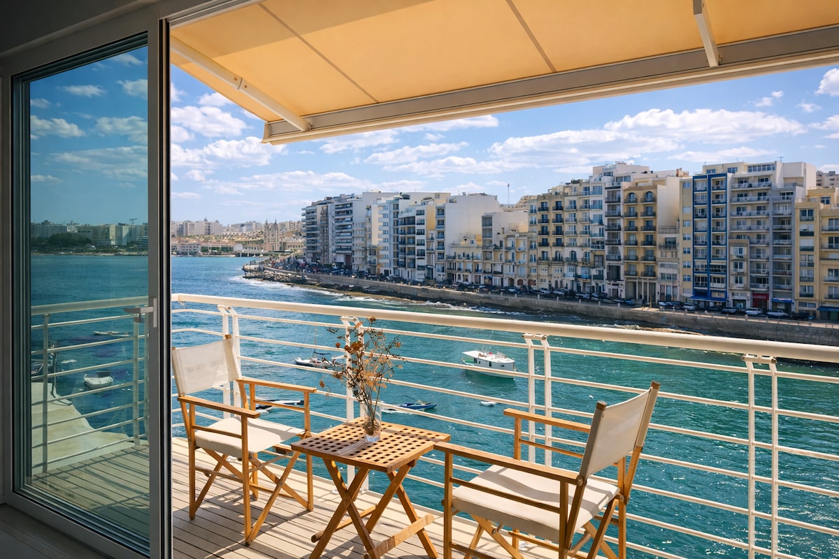 Stay directly on Spinola Bay in this 2 bedroom seafront apartment with uninterrupted sea views in the heart of St Julians. The apartment is bright, well furnished, and set up for comfortable stays. Both bedrooms are spacious with good storage, and the living area faces the bay, giving you open views throughout the day. The kitchen is fully equipped. Everything is on your doorstep restaurants, cafes, supermarkets, beach clubs, and nightlife, all within walking distance.