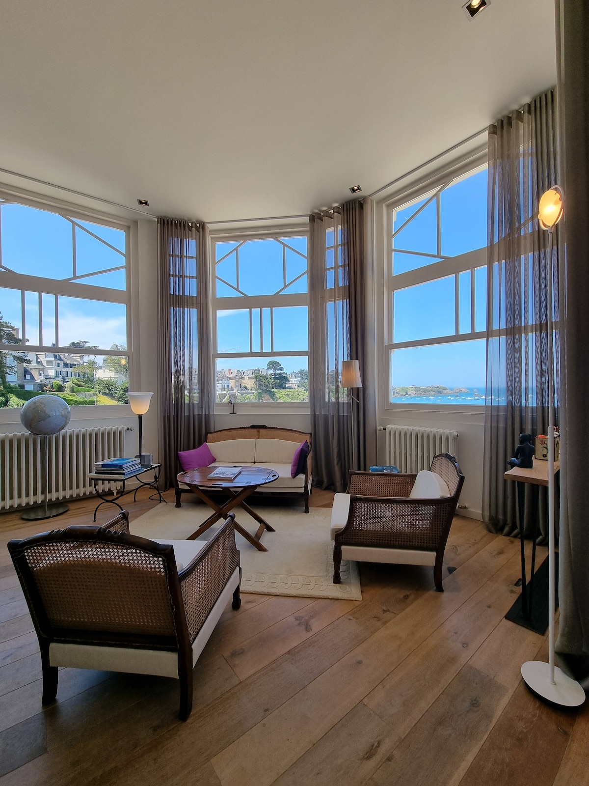 Appartement luxueux avec vue mer situé dans une villa XIX Dinardaise 42 m2 1 chambre Cuisine équipée Four , lave vaisselle , micro onde , cafetière Salle de bain Chambre avec télévison et lit 160 cm Coin salon avec canapé Parking privé gratuit sur place Draps et linge de bain compris Menage de fin de séjour compris nous demandons le nettoyage de la cuisine et vaisselle utilisé