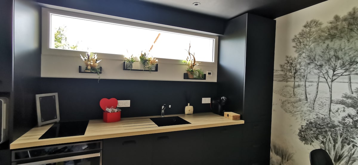 Détendez-vous dans ce logement calme et élégant. Appartement T1 tout équipé situé en rez de jardin d'une maison d'habitation occupée par un couple de jeunes retraités .Ce logement indépendant, neuf, baigné dans un écrin de verdure, situé à 10 minutes à vélo des commerces, à 1500 mètres à pied des plages via la forêt vous séduira par son calme. Vous pourrez découvrir la foret domaniale et son parcours sportif, emprunter les pistes cyclables du littoral directement depuis l'appartement.