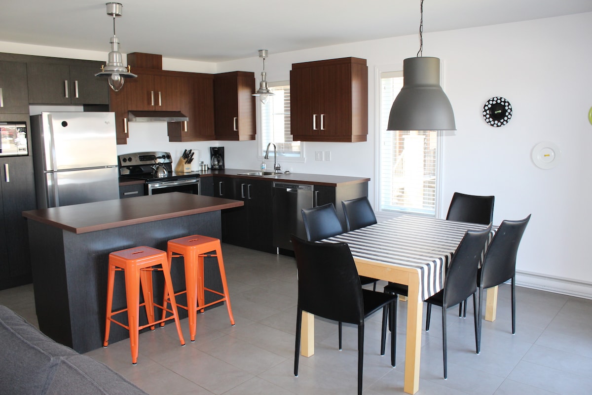 Zdravo, veliki smeštaj od 1480p2 na dva sprata u blizini Mont Ste-Anne. Nedavna izgradnja i kompletno namještena za osiguranu udobnost. Drveni kamin(drva nisu uključena), brzi WiFi, videotron kablovska televizija. Nalazi se 30 minuta vožnje od Starog Kvebeka i 35 minuta od Baie St-Paul. Sve atrakcije u okolini - Alpsko skijanje, skijaško trčanje, krpljanje. -dog sanke - minute Montmorency -Canyon Ste-Anne-Chutes Jean Larose - Planinski bicikl, biciklističke staze - prednje staze -Spas