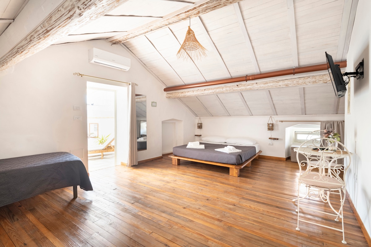 The room features a double bedroom with a shower corner surrounded by original stone walls and equipped with a chromotherapy system. It boasts floor lighting, a skylight on the barrel-vaulted ceiling, and an ancient fireplace. The suite is also equipped with air conditioning/heating, mosquito nets, bath and bed linens, a fridge, TV, Nespresso coffee machine, and a single induction hob for quick meals.
