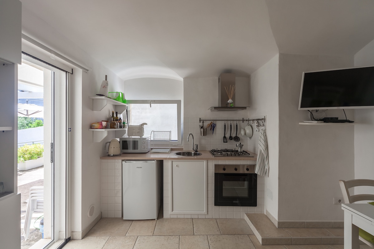 Fascinantan i karakterističan stan, apartman N. 8 se nalazi u zelenom i bezbednom prostoru sa svim sadržajima, na 500 m. od glavnog trga. Pogodno za jedan parove ili porodicu sa dvoje dece starije od 5 godina (prisustvo stepenica). Mini je nedavno renoviran sa visokokvalitetnim završnim obradama i visokim nivoom udobnosti: veliki tuš sa hromoterapijom, dupli TV i SkyTV, klima uređaj, mašina za pranje veša i elegantne forniture. Opuštajuća atmosfera, sa romantičnom alkoholom i veoma širokom terasom.