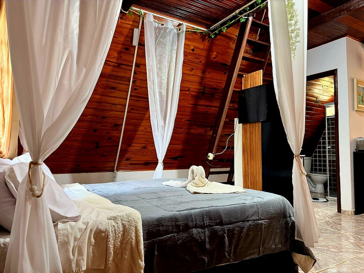 Povežite se s prirodom, planinska kuća u švajcarskom stilu, udobna, udobna, sa 2 spavaće sobe, američkom kuhinjom, kupatilom i opremljenom krevetima. TV , Wi-Fi, minibar, šporet, uređaji, pribor za jelo itd. U okruženju sa mnogo prirode , čistim vazduhom, odličnom strukturom . Seoski vanjski grijani bazen, Wi-Fi, fudbalski teren, lounge igre, prostor za kafu i trpezariju, kamin, roštilj, igralište, crveno, jezero za sportski ribolov, parking i još mnogo toga. Na 500mt od Nascente do Rio Tiete