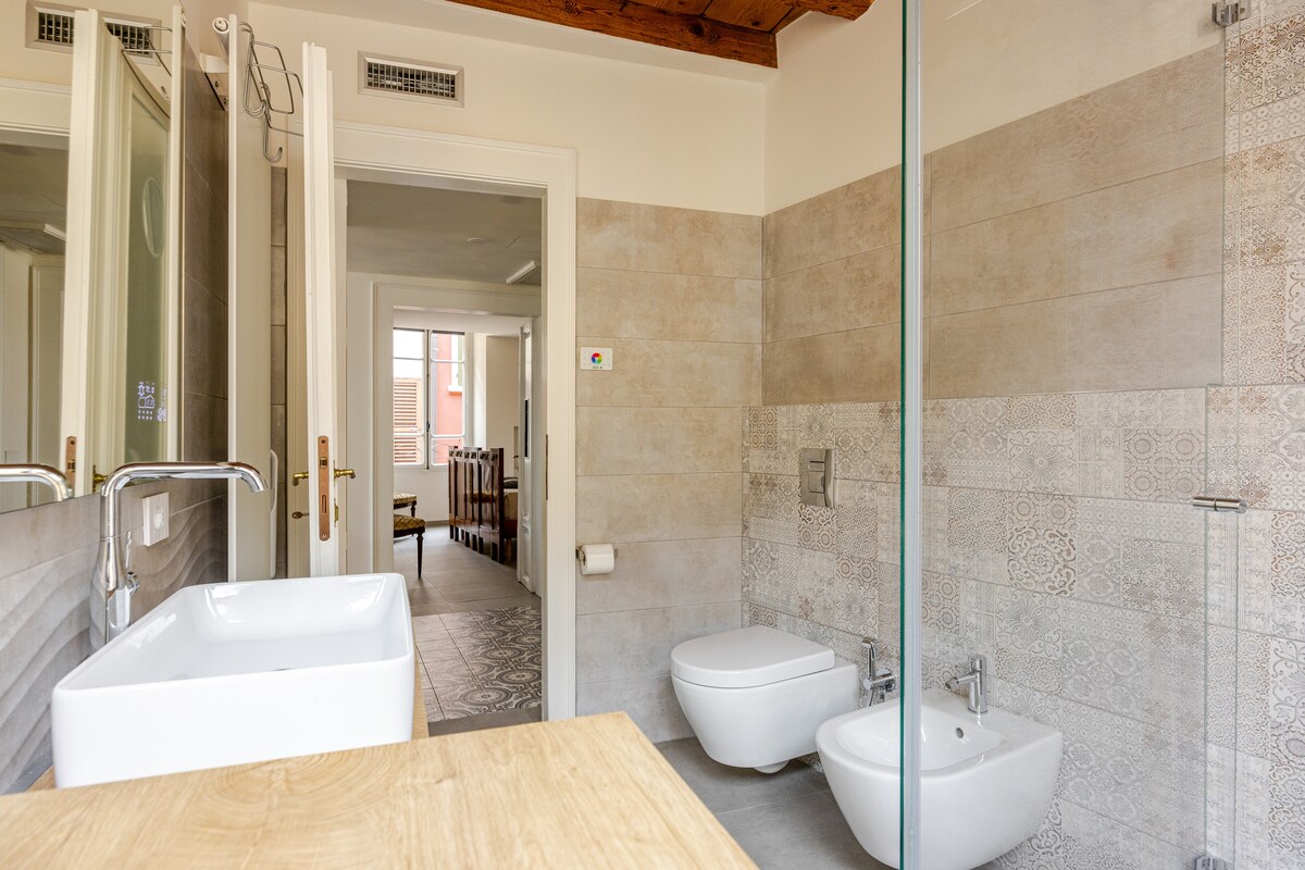 Dobro došli u istorijski centar Saloa, koji je udaljen 50 metara od katedrale i 70 metara od trajekta koji povezuje sve gradove na Gardskom jezeru. Odmah napolju ćete naći sve što vam treba: barove, restorane, prevoz, prodavnice, istorijske zgrade i prelijepo šetalište pored jezera. Stan ima restaurirani namještaj s početka 1900-ih koji je restaurirao akreditovani majstor, privatnu terasu i panoramski solarijum. Stan je na trećem spratu bez lifta, potpuno opremljen svim udobnostima.