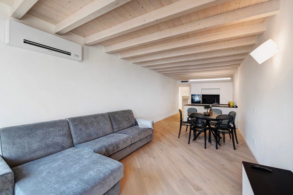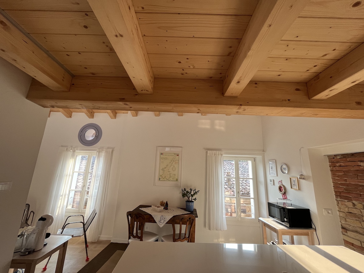 Smješten u karakterističnoj uličici istorijskog centra, nedaleko od jezera, organizovan je na dva nivoa. U prizemlju se nalazi ulaz, veliki dnevni boravak sa izloženim kamenim zidovima i licima opremljen čajnom kuhinjom, novo kupatilo sa prostranim tušem, mala vešernica sa mašinom za pranje/sušenje veša, a u potkrovlju na drugom spratu, velika i svijetla spavaća soba sa bračnim krevetom i klima-uređajem. Na zahtjev, dodatni krevet za jednu osobu (70 € dnevno) ili besplatan krevetac.