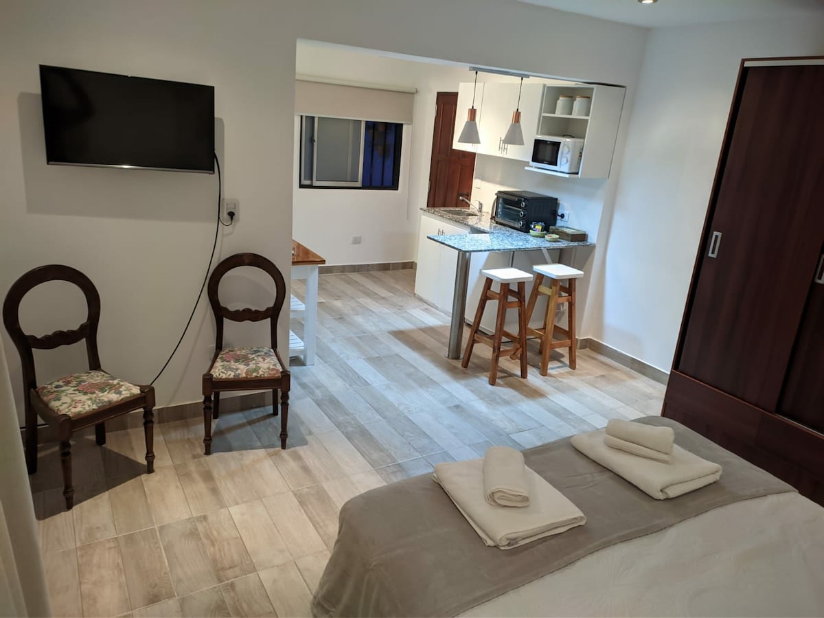 Mi smo Klaudija i Hose Luis, pripremili smo jednokrevetnu sobu od 25 kvadratnih metara kapaciteta za najviše 4 osobe. Imamo novi svijetli i šareni prostor. Nalazi se na veoma dobroj lokaciji, 50 metara od trga Plaza Alvarado, okružen je restoranima, picerijama, pabom, supermarketom. 10 blokova od centra i glavnog trga. Mirno i bezbjedno područje. Prostor koji nudimo ima zaseban ulaz, zajednički ulazni hodnik sa dvije kancelarije.