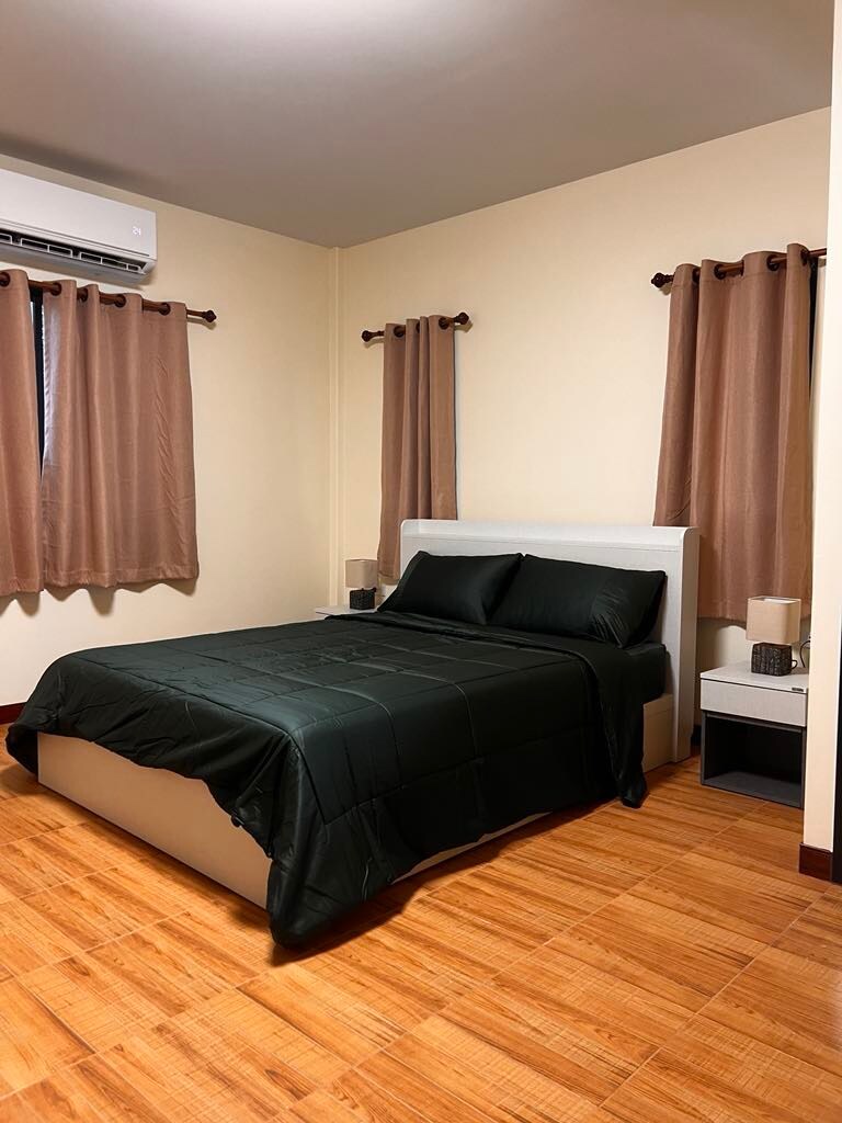 Opustite se sa cijelom porodicom u ovom mirnom smještaju. Uživajte u tajlandskoj farmi voća u okolini, zelenim otvorenim prostorima za porodičnu zabavu. Udoban sa kompletnim namještajem i eklektičnim namještajem. U blizini pijace, hrama i razgledanja Sufana Burija.