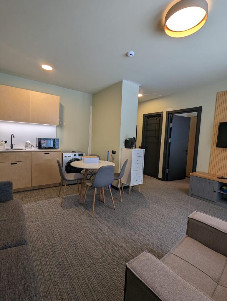 Udoban stan, 200m (6-7min) od žičare Didveli. Tihi stambeni kompleks u rezidenciji Didveli. Stan se nalazi u bloku F okružen šumom. Rezidencija Didveli uključuje restoran, supermarket, stadion, igralište i druge zabavne aktivnosti. • Potpuno opremljeno kupatilo sa peškirima, gelovima za tuširanje, šamponima, sapunima i fenom za kosu • Kuhinja (sve stvari) • Smart TV • Wi-Fi • Sistem centralnog grejanja • Garderoba