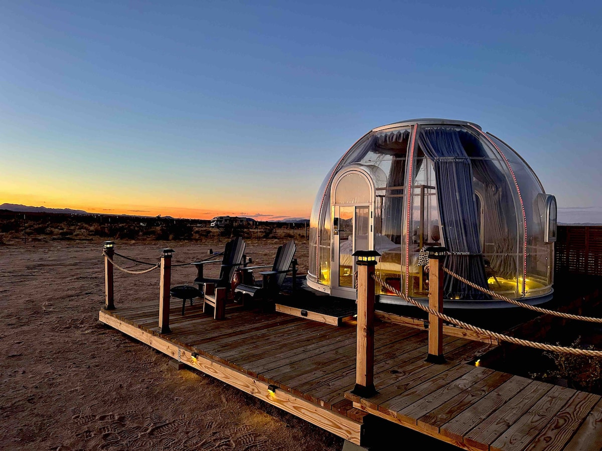 Pobjegnite u oazu smještaja Serenity Dome u blizini Džošua Trija! Ovaj jedinstveni dom u obliku kupole + gostinjska kuća nudi prostrane, fleksibilne prostore za porodice, odmor ili velike grupe. Zašto se gostima sviđa 🌵 Jedinstvena arhitektura kupole + pogled na pustinju 💦 Zagrijani bazen i đakuzi za zabavu tokom cijele godine 🔥 Ognjište, viseća ležaljka na drvetu i natkrivena terasa za jogu 🍴 Pokrivena terasa + roštilj za grupne obroke 🐾 Prikladno za pse + punjač za električna vozila 🎶 Bluetooth zvučnici u zatvorenom i pored bazena 🌌 Uzdignuta parcela od 2,5 hektara sa neverovatnim zalascima sunca i posmatranjem zvezda