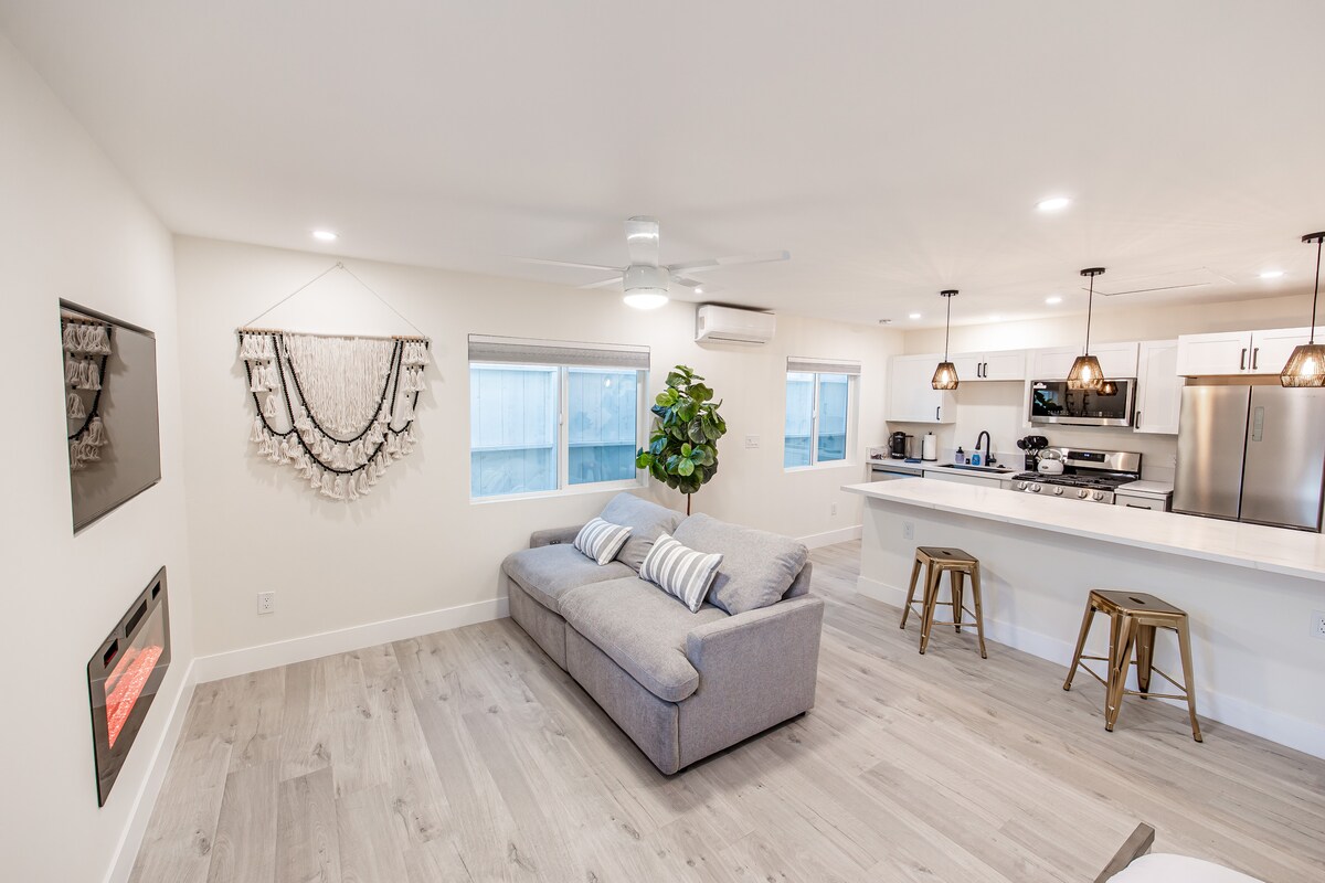 Predivna svetla, centralno smeštena prostrana garsonjera. 2 Beach Cruisersa dolaze sa jedinicom. Pušenje/420 je dozvoljeno na privatnom dvorištu s pogledom na našu malu zen baštu. Spa centar kao što je tuš. Jednostavno pronađite bezbjedan parking na ulici ispred objekta. Kamin za zimu, klima-uređaj za ljeto. Uskočite na krstarice na plaži i krenite na plažu udaljenu 1,3 milje ili u sjajne barove PB-a. Luksuzni madrac na jastuku. Soni TV od 55 inča sa Apple TV-om. Grickalice, voda, kafa. Obezbeđeni su peškiri za plažu, frižider i ležaljke za plažu.