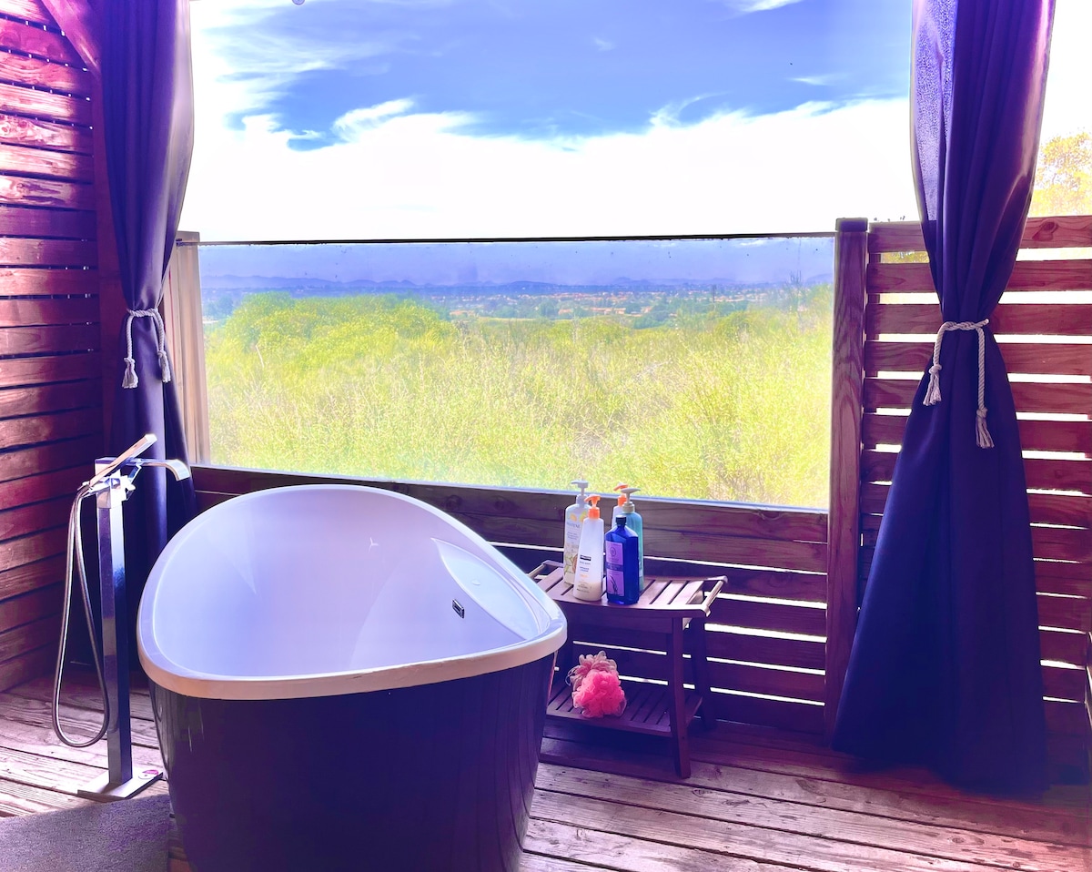 Smještena u tihom kanjonu na padini sa panoramskim pogledom na grad i zalazak sunca, samo nekoliko minuta vožnje od centra San Dijega, ova glamping oaza nudi: ✦Privatna hidromasažna kada pod zvijezdama ✦Prilagođena sauna na drva ✦Podloga za golf ✦Brzi Wi-Fi ✦Klima-uređaj i grejanje ✦Ograđen parking, van ulice Udobno se smestite pored vatre dok se grad ispod vas presijava ili okušajte svoju sreću na golf terenu. Povežite se i napunite baterije u sopstvenoj hidromasažnoj kadi na otvorenom, tušu sa kišom i sauni na drva – savršeno utočište za ljubitelje prirode!