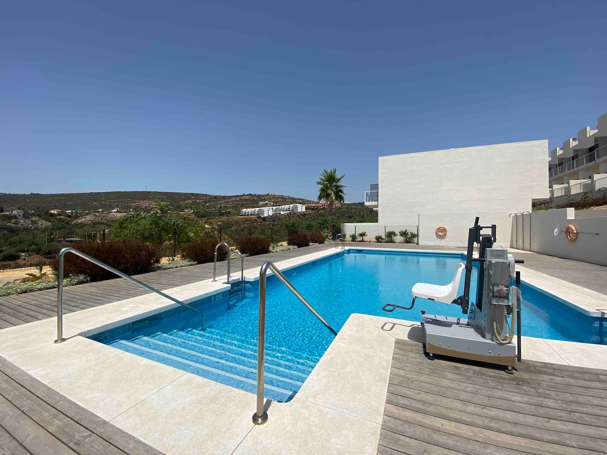 Naš stan se nalazi između Marbele i Gibraltara na kraju prirodnog rezervata, samo 400 metara ili 5 minuta hoda od plaže u zalivu Kala de la Sardina. Između udobne plaže „Playa los Toros” i plaže „Punta Chullera Doradas”. Ujutro uživajte u predivnom izlasku sunca iz kreveta Moderan stan ima 2 spoljna bazena i dodatni spoljni bazen za djecu. Postoji unutrašnji bazen, mala sauna i mala teretana.