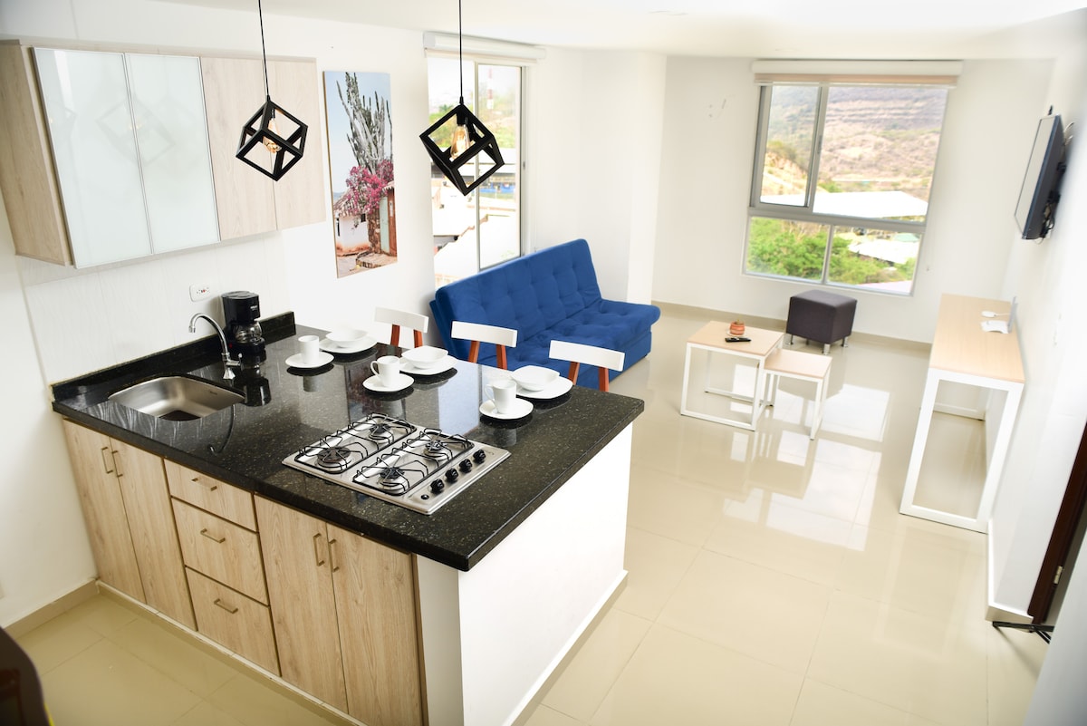 Dođite u San Gil, uživajte u ovom prelijepom stanu 12 minuta hoda ili 3 minute automobilom od centralnog parka grada Stan sa odličnim pogledom. Dve spavaće sobe i dnevnu sobu sa kaučem na razvlačenje. Kapacitet za 6 osoba koje udobno spavaju; 2 u bračnom krevetu, 2 u bračnom krevetu, 1 u krevetu za jednu osobu i 1 na kauču za jednu osobu. mašina za pranje veša, privatna garaža sa električnom kapijom, privatna terasa od 20 m2, kuhinja, balkon, 1 glavno kupatilo, pomoćno kupatilo i mermerni trpezarijski bar. Jedan Netflix nalog