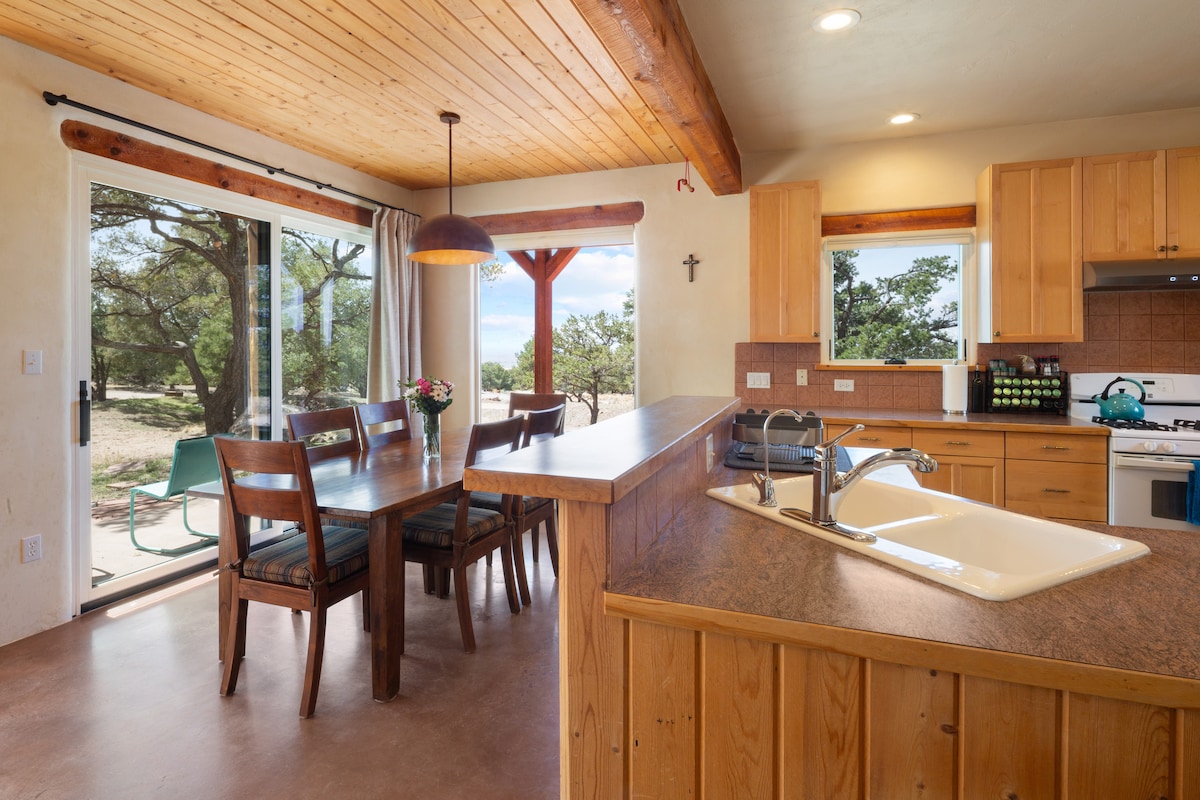 Smešten u podnožju planinskog lanca Sangre de Kristo u južnom Koloradu, ovo je jednostavan i elegantan solarni dom u stilu opeke koji će sigurno smiriti vaš um i zagrijati vaše srce. Kuća se nalazi na 3-1/2 hektara stabala pinona i junipera i nudi zadivljujući pogled na dolinu i planine - sve je okruženo dubokim osećajem tišine. Zbog nedostatka gradskih svjetala i visoke visine Krestona, zvijezde su izuzetno svijetle na noćnom nebu. Kuća ima potpuno opremljenu kuhinju i dve zasebne spavaće sobe