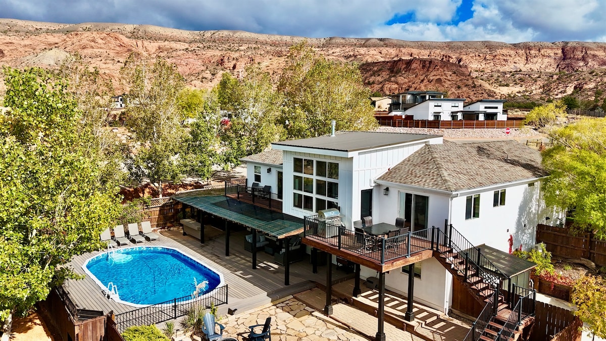 Ovaj prilagođeni smještaj ima 4 spavaće sobe, 2,5 kupatila i dovoljno prostora za goste. Dnevni boravak na glavnom nivou, kao i soba za porodicu/zabavu na gornjem nivou, 3 natkrivena unutrašnja dvorišta i natkriveni balkon, ognjište, hidromasažna kada i spoljni tuš. Dom se nalazi u mirnom komšiluku 15 minuta južno od centra Moaba i veoma je blizu bezbrojnih puteva i planinarskih staza. Dovoljno parkinga u garaži za automobile dimenzija 25'x25', prilazu za 3 automobila ili na ulici sa 2 strane kuće koja se nalazi na uglu.