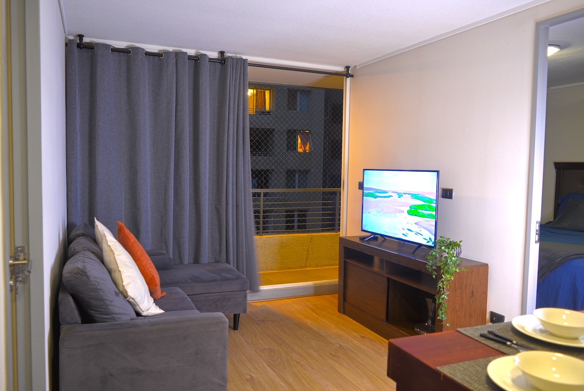 Acogedor y luminoso departamento con balcón, equipado con cama queen y un futón para un tercer huésped. Cocina Full Equipada Wi‑Fi 500 Mbps Smart TV Pet‑friendly A solo 3 min del Metro Departamental, supermercados, restaurantes y cafés a pasos. Autopista Central a solo 5 min. Disfruta de gimnasio, quinchos y lavandería autoservicio en un edificio residencial seguro con conserjería 24/7. Ideal para parejas y estadías largas. ¡Reserva y vive Santiago como en casa!