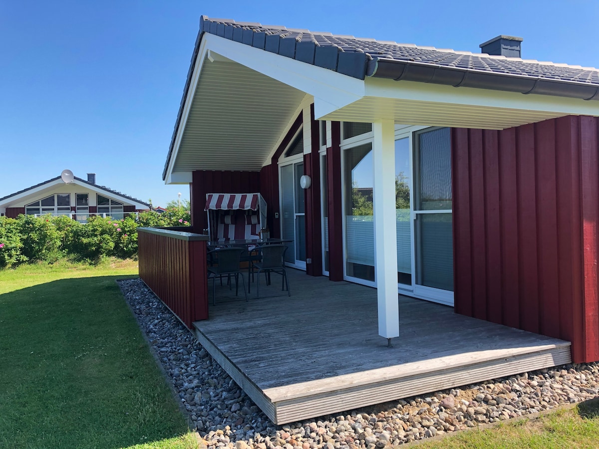 Udobno namještena kuća za 4 osobe nalazi se direktno na nasipu (300 m) i tako je na pješačkoj udaljenosti od plaže. Kuća je izgrađena u stilu bungalova i ima oko 65 kvadratnih metara stambenog prostora. Cijela površina objekta je oko 500 m2. U dnevnoj sobi se nalazi lijep kamin koji vas poziva na hladnu sezonu. Sve sobe su u prizemlju. Prostrana bašta sa velikom terasom, stolicom za plažu, baštenskim nameštajem i predivnim kaminom za roštilj poziva vas da se zadržite.