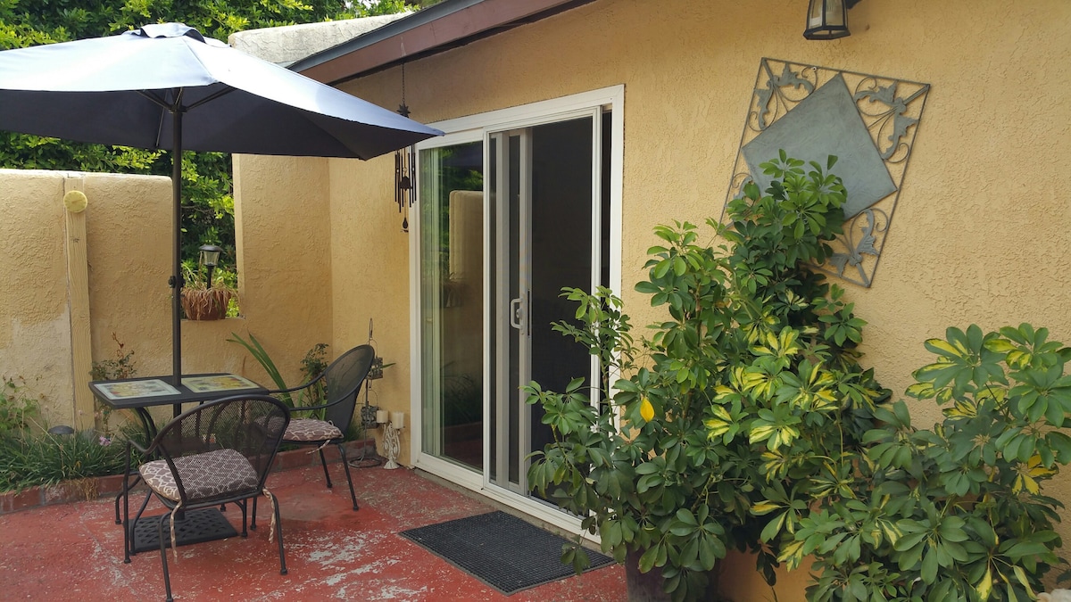 Predivno namješten Veliki JEDNOSOBNI studio/apartman sa privatnim kupatilom i ulazom . Veliki bračni krevet, 42-inčni TV, brzi internet, veliko privatno kupatilo, privatno dvorište, čajna kuhinja, mali frižider sa zamrzivačem, mikrotalasna pećnica, potpuno opremljeno. Unutrašnje dvorište je samo za vašu upotrebu, roštilj. Studio je zidom povezan sa glavnom kućom. Blizu Montecita, tržnog centra i restorana, 2,4 km do plaže, 3,2 km do centra Santa Barbare i luke. Iznajmljivanje bicikala je udaljeno 1 blok. Zabranjeno je pušenje, samo pored parkinga