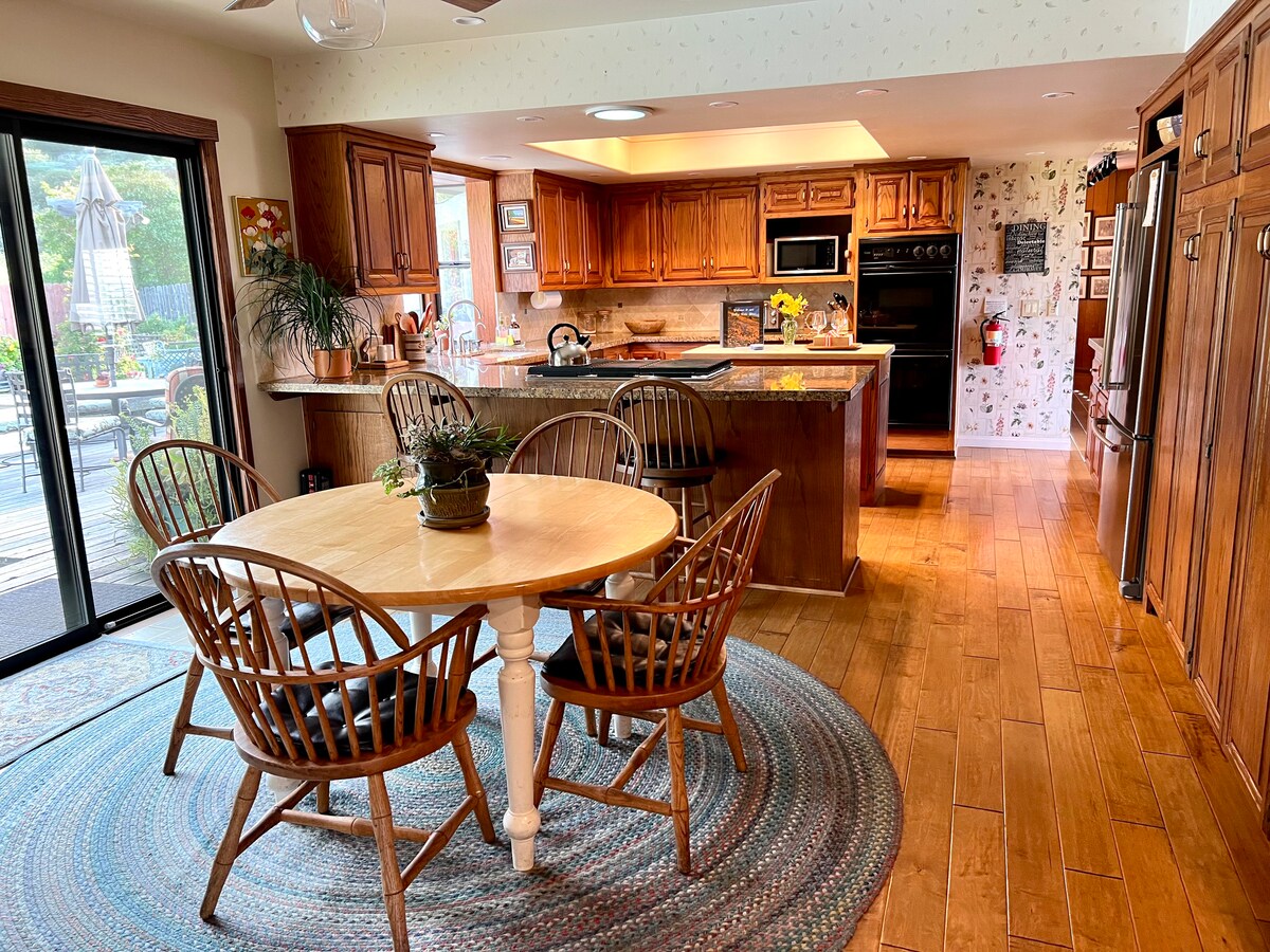 Velika kuća za odmor koja se nalazi na vrhu privatne vožnje sa prelepim pogledom na brda. Potpuno opremljena kuhinja sa svime što je potrebno za porodično praznično okupljanje - 2 rerne, 2 mikrotalasne rerne, fioka za zagrijavanje, rezervni frižider/zamrzivač u garaži. Veliki TV u svakoj spavaćoj sobi i u dnevnim sobama. Balkon ispred spavaće sobe na spratu sa vrtnim namještajem i grijalicom; trpezarija i prostor za sjedenje na zadnjem dvorištu sa stolom za loženje, grijalicama i hidromasažnom kadom. Roštilji na gas i pelete, hibachi/teppanyaki roštilj.