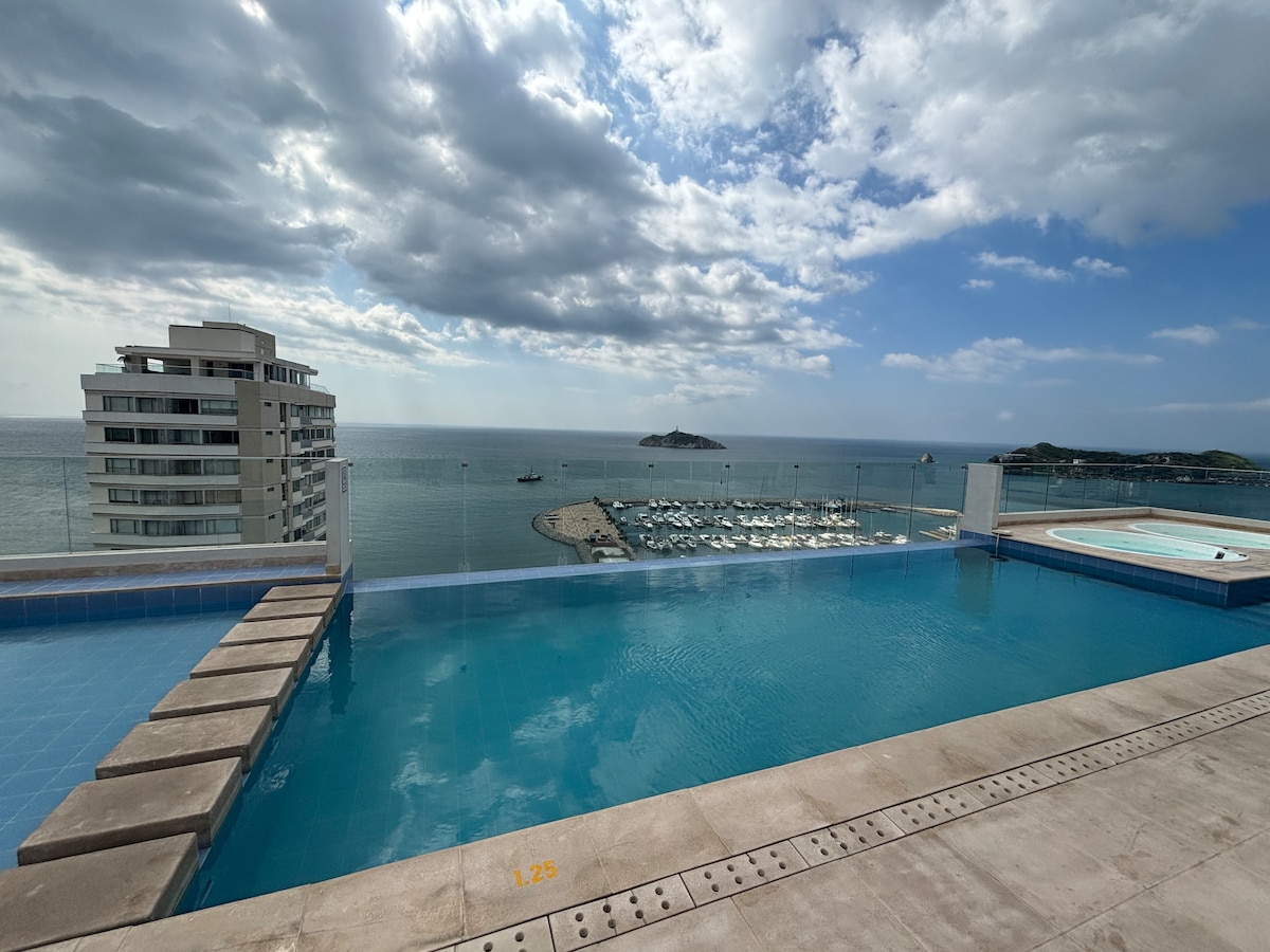 Doživite nezaboravno iskustvo u Santa Marti sa porodicom ili prijateljima u prelepom klubu na plaži. Naći ćete: 🛁 Hidromasažne kade. 🛏️ 2 sobe sa bračnim krevetima (širine 150–179 cm) i krevetima za jednu osobu. 🍳 Dobro opremljena kuhinja za pripremu svega što vam zatreba. 🌅 Privatni balkon sa bočnim pogledom na okean. 🏖️ Direktan pristup plaži 🏊 Zgrada sa 4 bazena. 🏋️ Teretana. 🧖 Spa i vlažne prostorije. 🍽️ Restoran sa opcijom doručka. 👩💻 Prostor za zajednički rad. 🔐 Ekskluzivno i bezbedno okruženje.