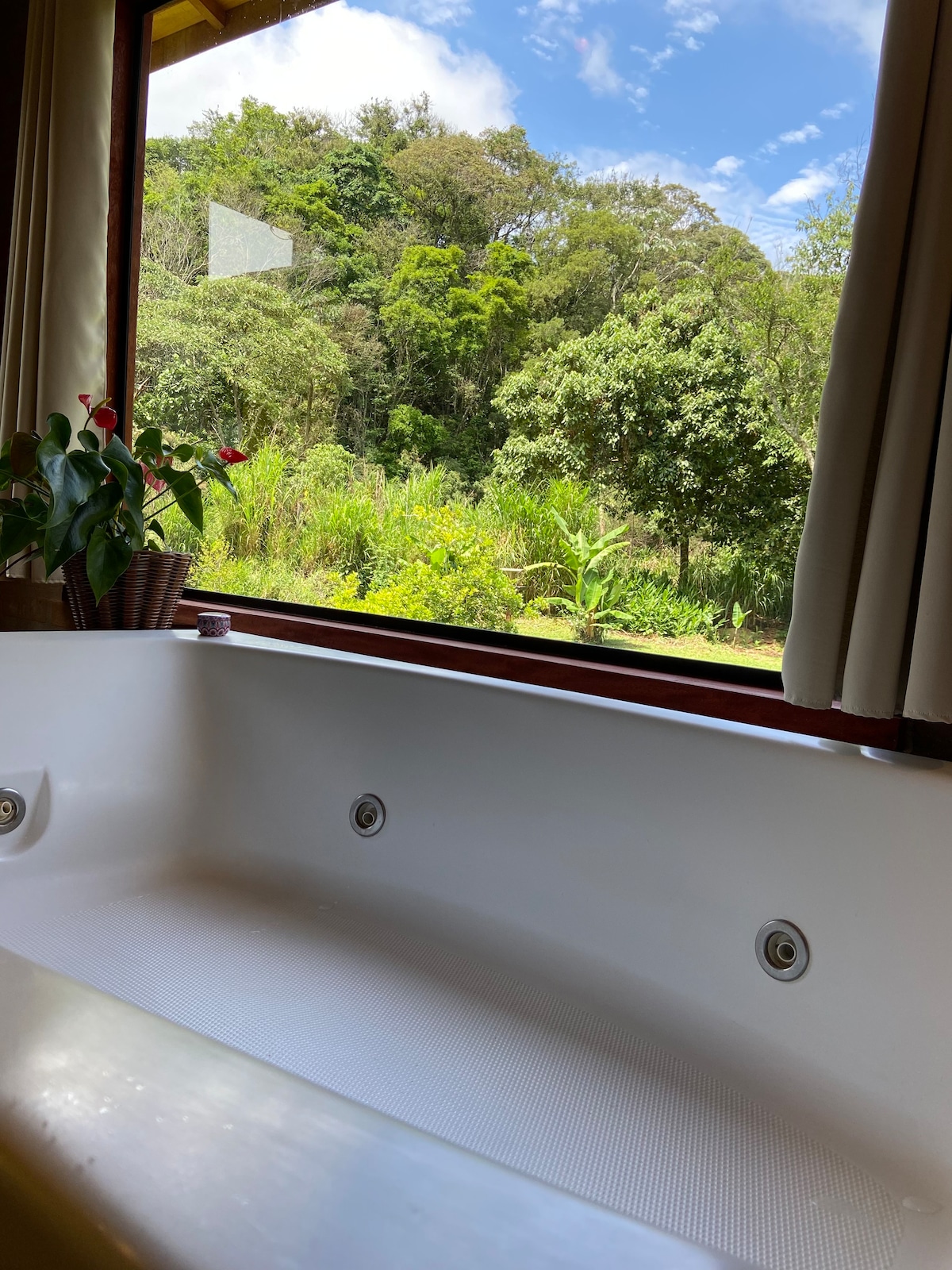 O chalé Nosso Cantinho foi feito com muito carinho e pensamos em cada detalhe para oferecer conforto e dias inesquecíveis. Chalé estilo rústico, novo, amplo, com lareira e com destaque para banheira redonda dupla de hidromassagem com cromoterapia com vista para araucárias.