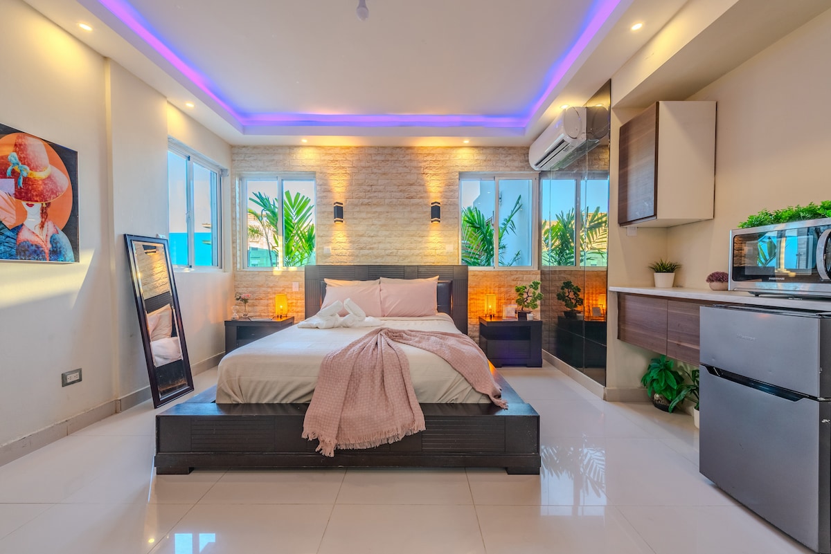 Descubre este estudio de lujo frente al mar, con una vista panorámica que puedes disfrutar desde cualquier rincón del espacio. Vive una experiencia de privacidad total, sin construcciones al frente, solo el azul infinito del mar Caribe. A pocos minutos de la Av. George Washington, con acceso rápido a las principales vías de Santo Domingo. Ideal para descansar, desconectarte, trabajar o disfrutar de una escapada romántica con comodidad, elegancia y paz frente al mar.