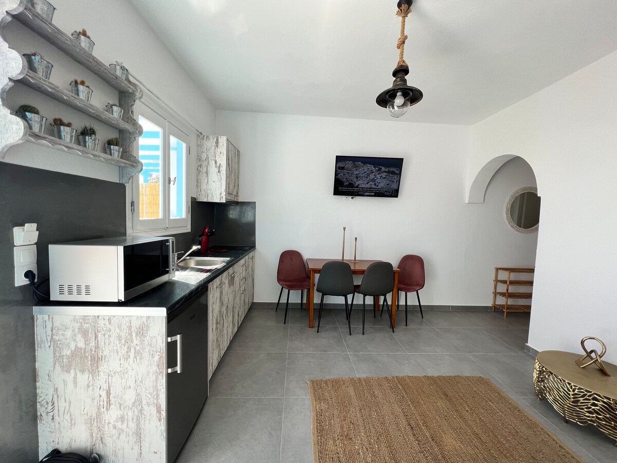 Uživajte u svom privatnom stanu na Santoriniju u našem butik apartmanu Santorinn, koji se nalazi u srcu Fire. Ovaj obnovljeni stan na 1. spratu kombinuje modernu udobnost sa tradicionalnim grčkim šarmom - savršeno utočište za porodice, grupe prijatelja ili parove koji putuju zajedno. Mirna četvrt u centru Fire, stan je udaljen samo nekoliko koraka od besplatnog parkinga i na pješačkoj udaljenosti od restorana, prodavnica, noćnog života i poznatog vidikovca Kaldera — samo 1 minut hoda!