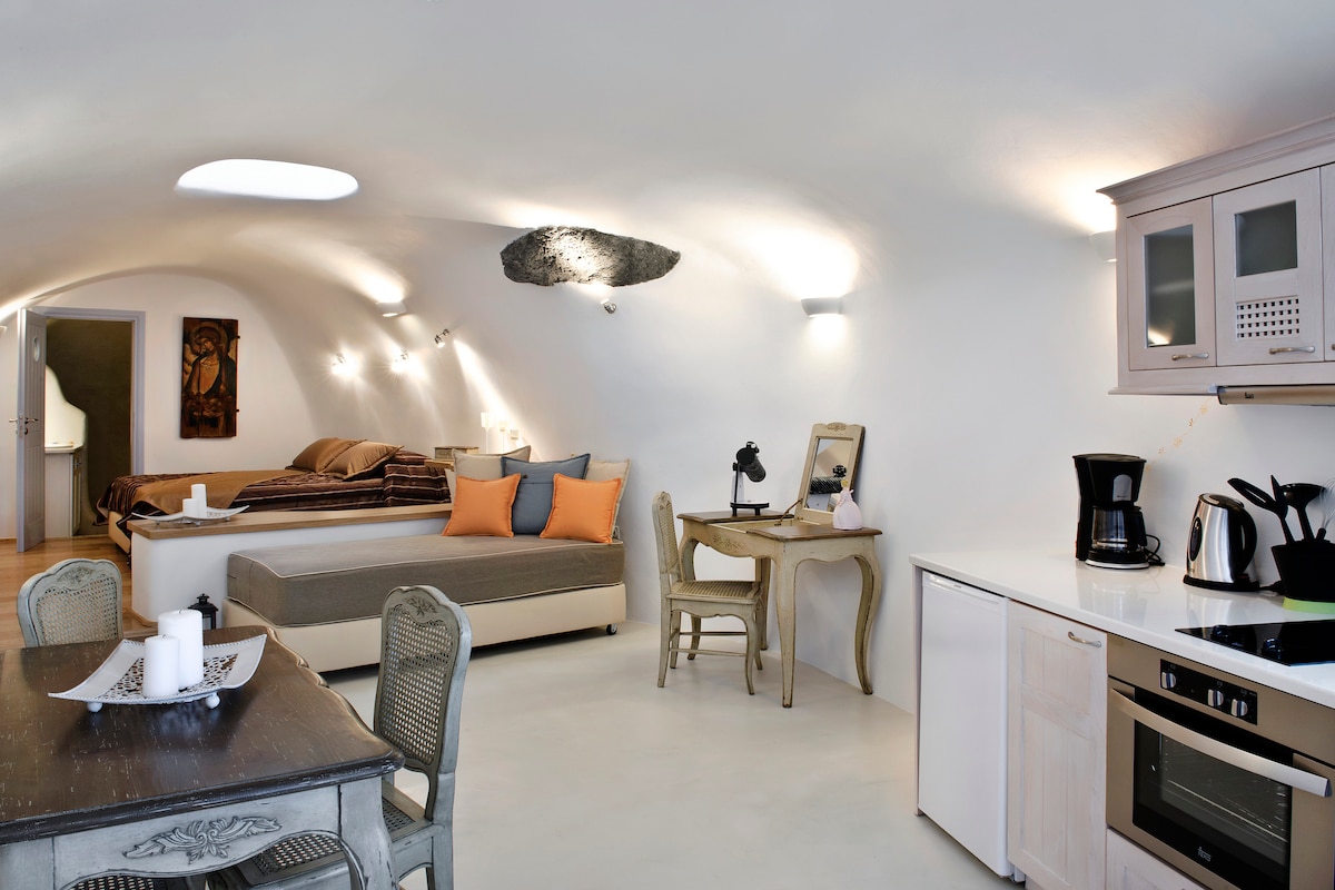 Soba Character Cave (22 m2) ima prozor sa pogledom na more u kalderi i sadrži privatni unutrašnji bazen*, mini-bar, veliki bračni krevet, bademantile, papuče, luksuzne sadržaje, tuš sa efektom kiše, sef, klima-uređaj i privatno kupatilo. *Mali bazen ima hidromasažne mlaznice i temperatura se kontroliše na približno 30 °C. Doručak po narudžbi se služi u sobi. Imajte na umu da se ova soba nalazi na glavnoj starinskoj stazi i da nema vanjskih prostora kao što je balkon.