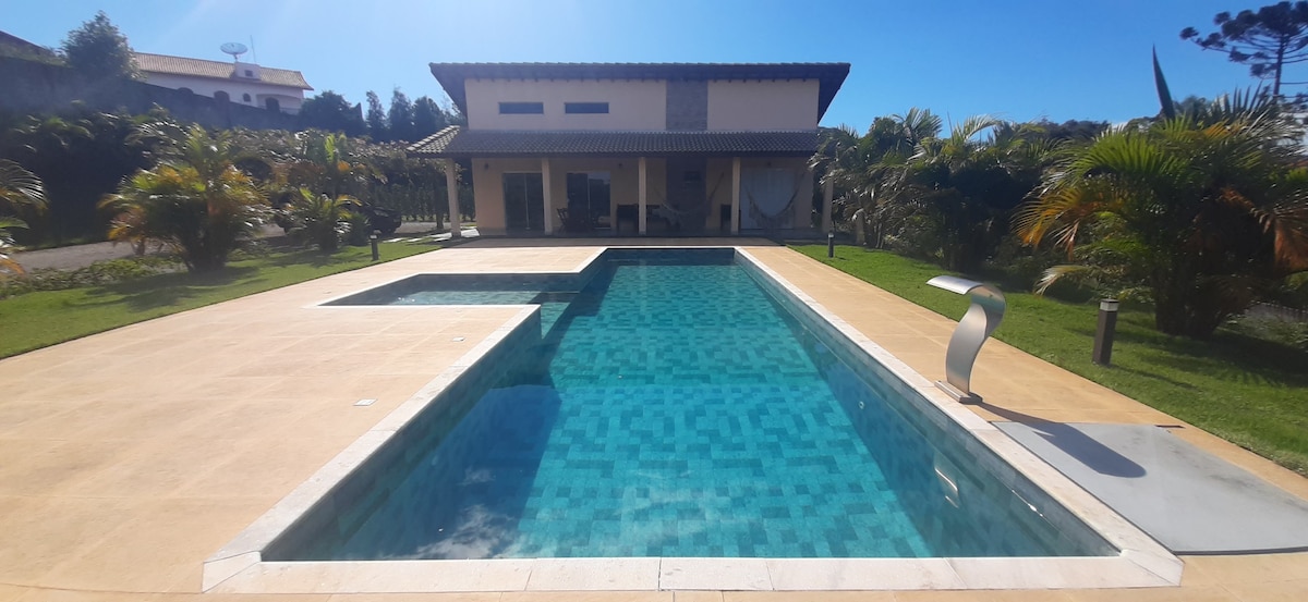 Kuća na selu, sa potpunim odmorom za odrasle i djecu 50 minuta od Sao Paola - glavnog grada. Prostrana i udobna kuća za do 15 osoba, 6 apartmana i balkona. Ako treba da primite 17 osoba, OBRATITE NAM SE. Prostran, udoban gurmanski prostor sa frižiderom, pivom, roštiljem i rernom za picu na drva. Idealno za uživanje sa porodicom i prijateljima tokom ljeta uživajući u bazenu ili zimi uživajući u kaminima.