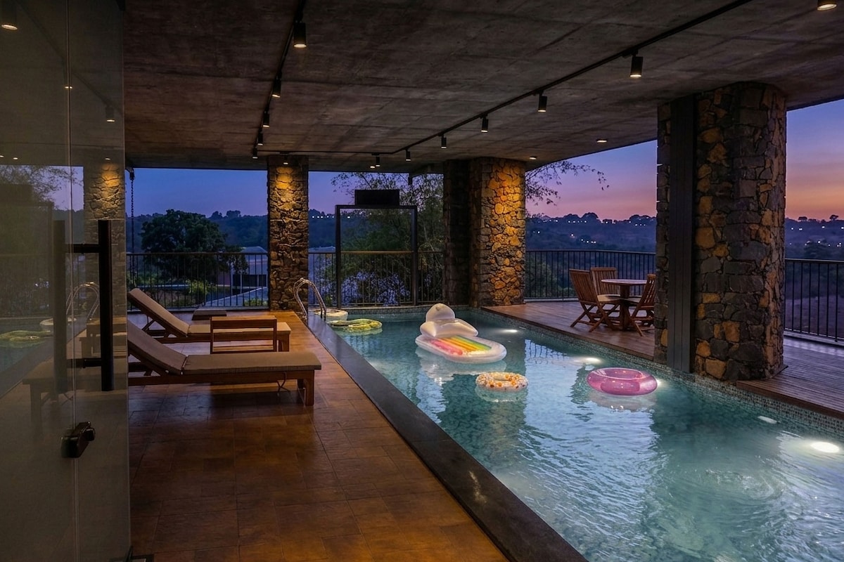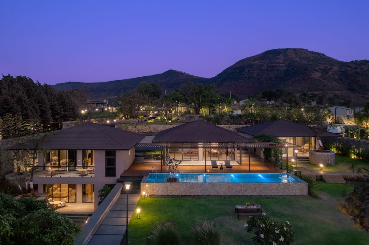 Doživite profinjeni luksuz u ovoj modernoj vili sa privatnim bazenom, gde se savremena arhitektura neprimetno stapa sa prirodom. Ovaj ekskluzivni 3BHK u blizini Igatpurija 50 minuta od Našika i 3,5 sata od Mumbaija može udobno da spava 6–9 gostiju. Uživajte u privatnom bazenu, igrama u zatvorenom i na otvorenom, amfiteatru za filmske večeri, potpuno opremljenoj kuhinji, kuvaru u sklopu objekta (uz doplatu) i prostoru prikladnom za kućne ljubimce, savršenom za porodična putovanja i proslave.