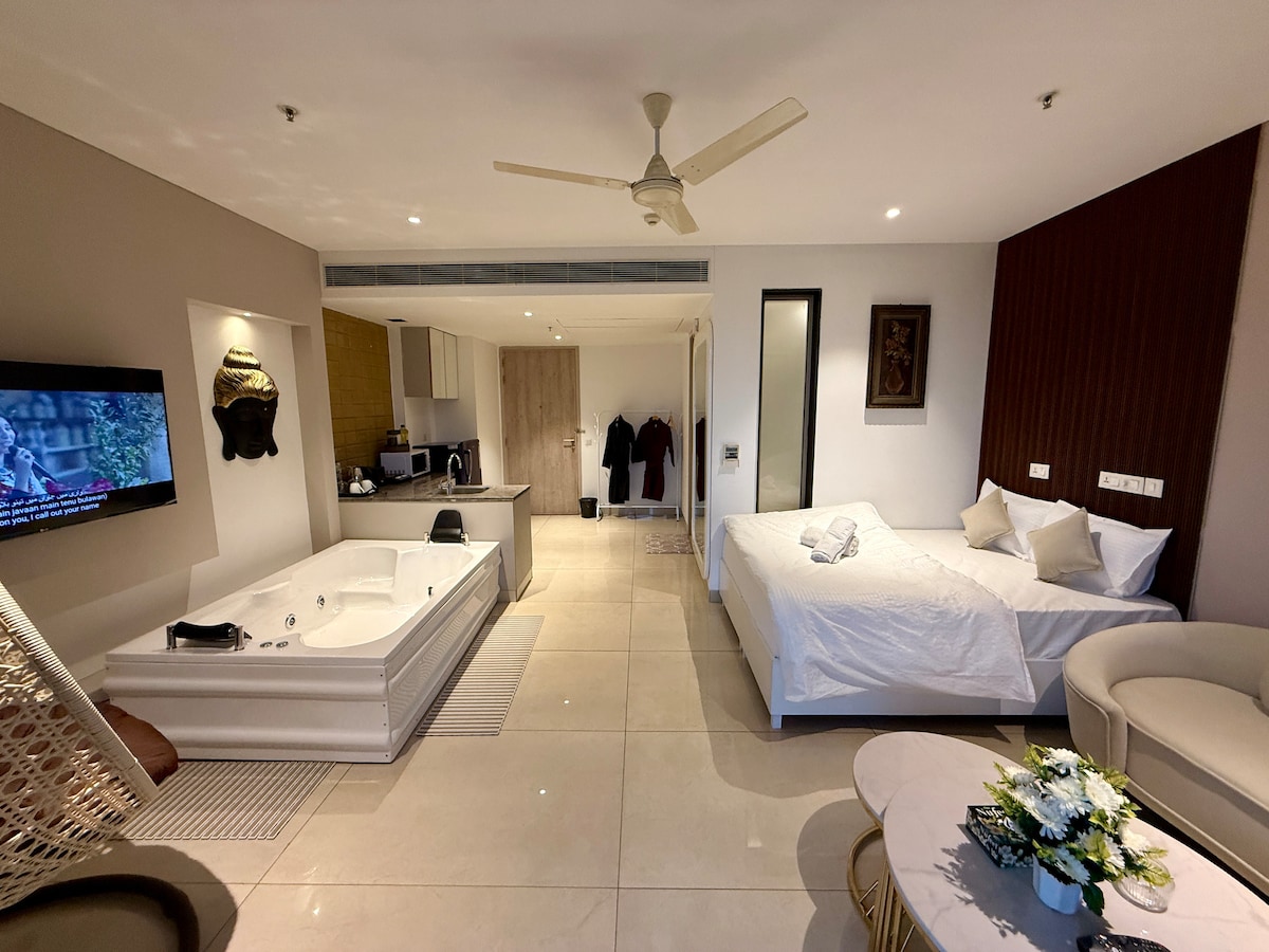 Dobro došli u naš elegantni studio na AIPL Joy Squareu! 1. Moderan studio sa raskošnim kupatilom i svim osnovnim sadržajima. 2. Besplatan parking u sklopu objekta sa samostalnom prijavom i odjavom non-stop. 3. Najbolja lokacija u otmjenom Gurgaonu sa odličnom povezanošću. 4. Brzi internet i pametni televizor za zabavu samo uz Youtube 5. Potpuno opremljena kuhinja sa mikrotalasnom rernom,tosterom, indukcijom i još mnogo toga. 6. 10 minuta do metroa, 2 minute do tržnog centra Joy Square, 20 minuta do DLF Galleria, 5 minuta do drugog kafića