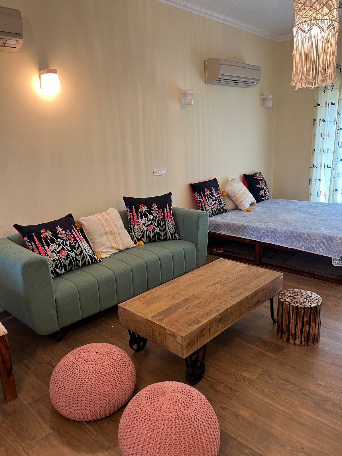 Opustite se na ovom jedinstvenom i mirnom odmoru samo sat vremena od Delhija. Smješten u prelepom Aravalisu, okružen bujnim zelenim terenom za golf, ovaj studio ima mnogo toga da ponudi. Potpuno opremljena čajna kuhinja, divan prostor za sedenje, udobna spavaća soba i salon, potpuno novo kupatilo, internet, pametni TV, restoran svetske klase u kompleksu, staze za šetnju i prelepi pogledi. Uhvatite zalazak sunca i posmatrajte izlazak meseca na čistom nebu. Doživite moderno sa rustikalnim, jedinstvenim doživljajem.