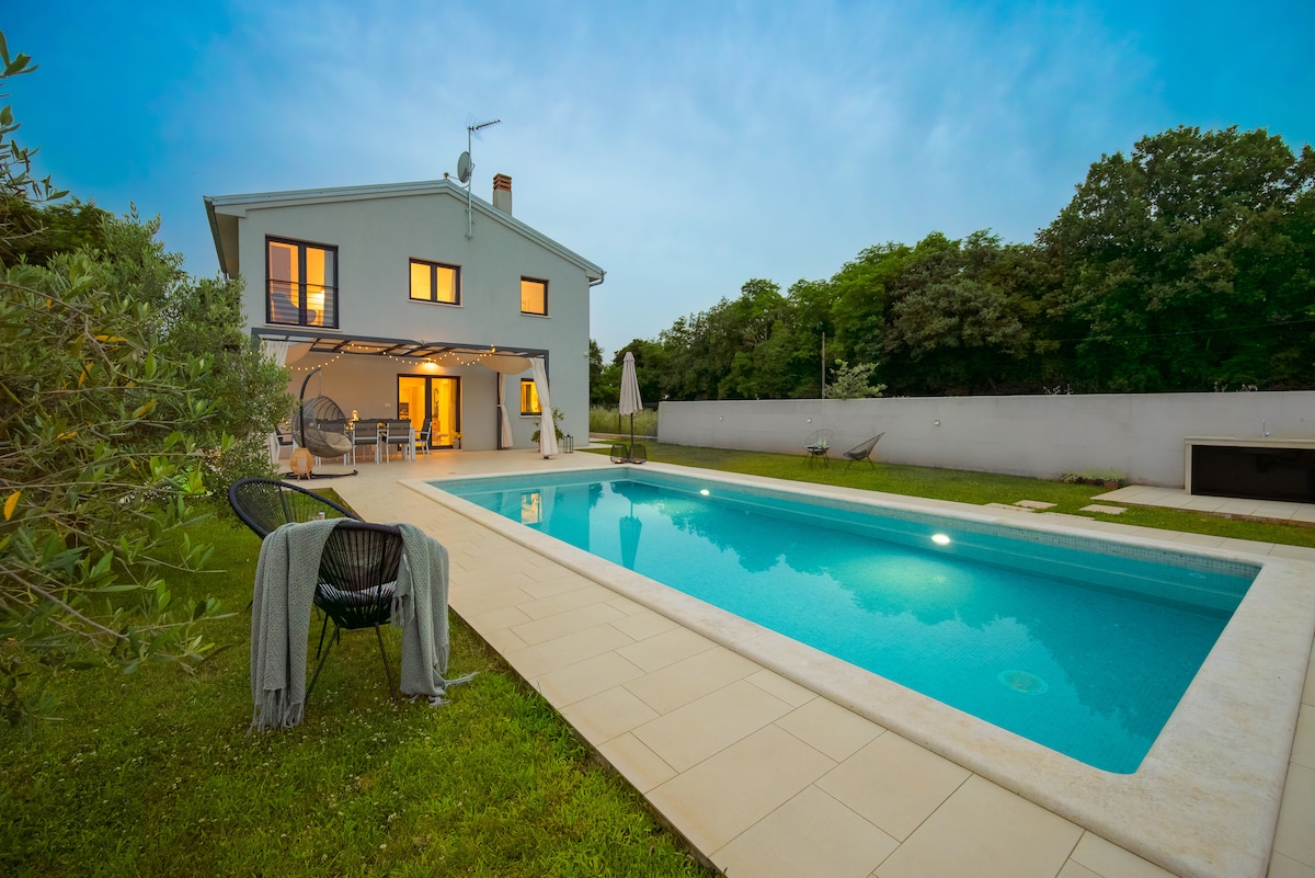 Elegantna vila u blizini Rovinja sa bazenom vrednim fotografisanja, hidromasažnom kadom i saunom. Probudite se uz bujne, panoramske poglede na dolinu. Pogodno za parove i porodice, kratka vožnja do avanturističkog parka, Nacionalnog parka Brioni, dinoparka, srednjovekovnih gradova i lokalne kuhinje. To je pravi zeleni odmor za svakoga ko želi da se vrati prirodi sa svom udobnošću modernog života. Potpuno opremljen za kuvanje i zabavu na 2600 m2 bašte (fudbal, brza lopta, badminton i zabava u bazenu) za uživanje vaše djece i najmilijih.