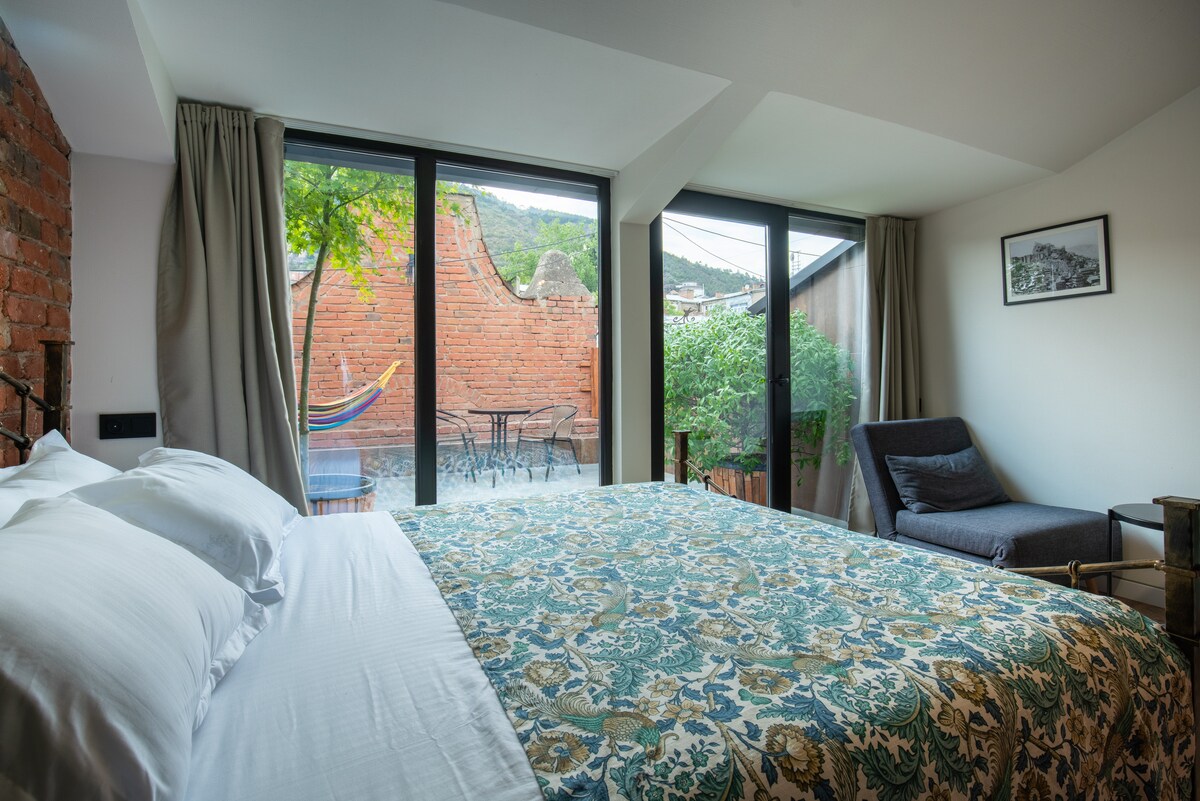 Ovo je udoban renovirani stan sa izloženom ciglom koji ima pravi osećaj u Tbilisiju. Ovaj studio ima prozirno kupatilo sa modernom kadom, bračnim krevetom, kaučem na razvlačenje i sl. Prostor (78 kvadratnih metara) se nalazi u staroj četvrti Tbilisi, u paralelnoj ulici glavne avenije Džordžija Šota Rustaveli. Brzi WI-FI internet i IPTV su besplatni. Stan je takođe dobro lociran za prevoz stanica Metro Freedom Square i Rustaveli.