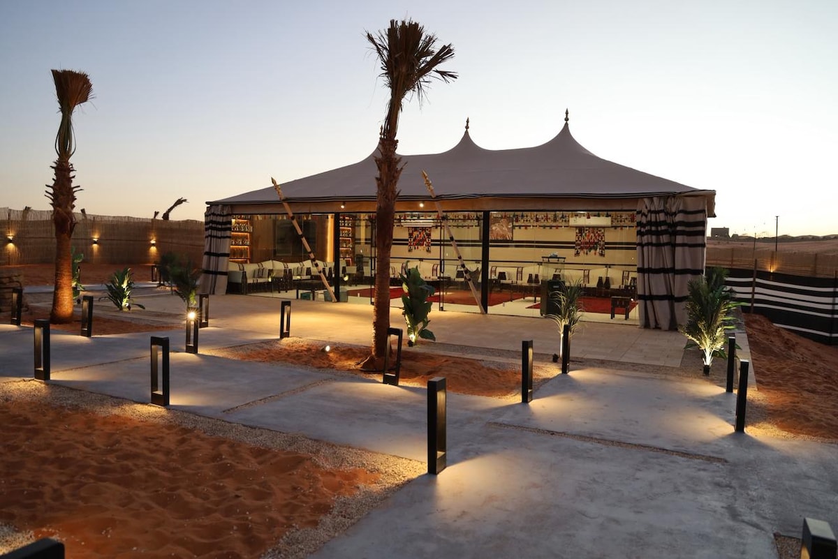 تجربة فاخرة بين الكثبان الرملية تجمع بين سحر الطبيعة ورفاهية التفاصيل. يضم المنتجع خيمتين كبيرتين تتسع كل منهما لـ 50 شخصًا على الأقل، وثلاث جلسات خارجية أنيقة تتسع كل منها لـ 20 شخصًا. كما يوفر فناءً رمليًا واسعًا، عريشًا تقليديًا، مطبخًا متكاملًا، وغرفتي نوم إحداهما ماستر، إضافة إلى مواقف سيارات واسعة. وجهتك المثالية للمناسبات والتجمعات في أجواء صحراوية فريدة.