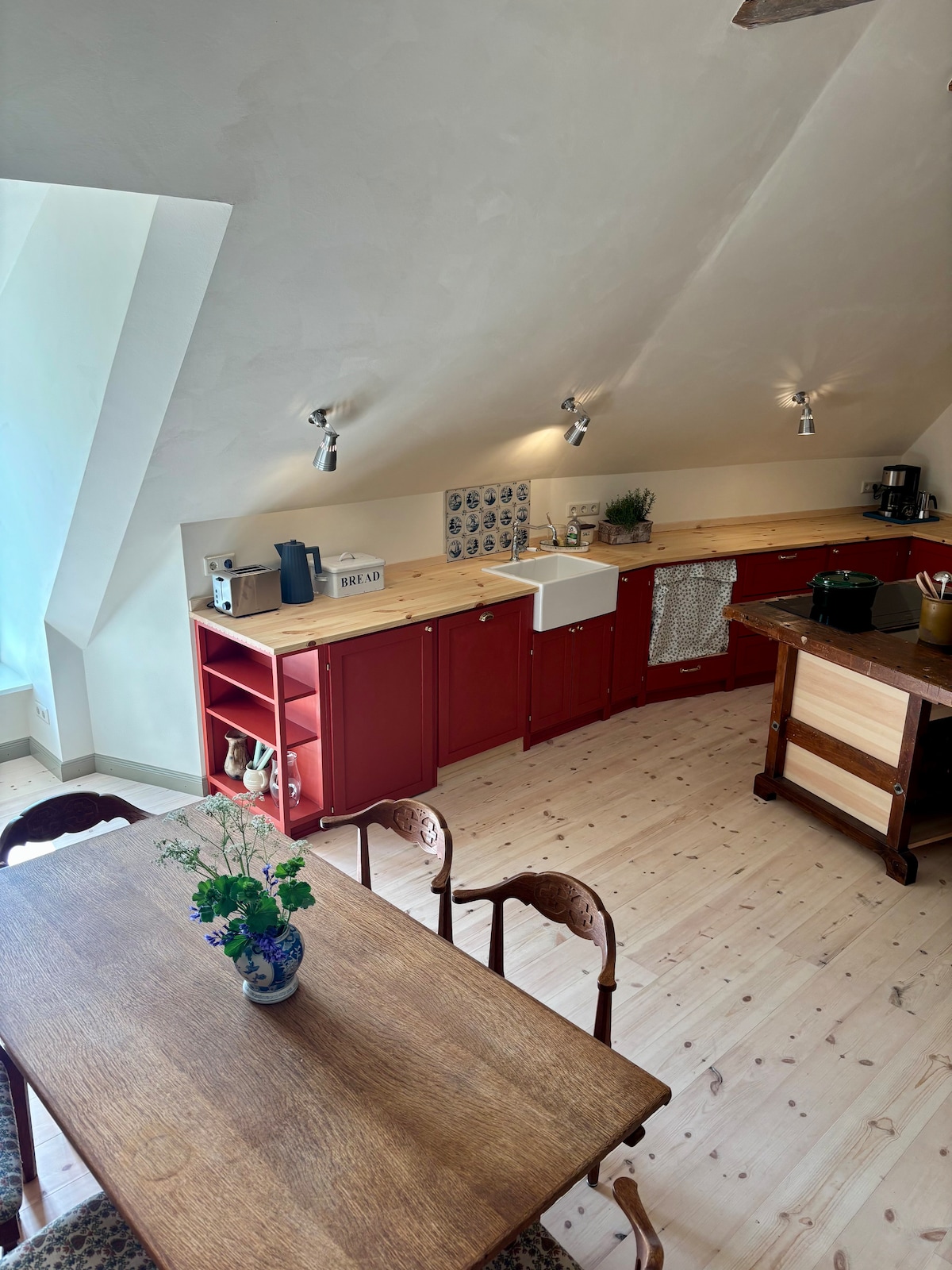 Das Appartement liegt im hinteren Seitenflügel des Altstadthauses in einer ruhigen Gasse. Im unteren Bereich des offenen Studios lädt ein (Schlaf-)Sofa zum Verweilen ein, eine Küchenzeile bietet Raum zum Genießen kleiner Mahlzeiten. Eine schmale Wendeltreppe führt in den Schlafbereich unterm Dach, in dem ein kuscheliges Doppelbett zur Verfügung steht, direkt dahinter gelangt man in das kleine, moderne Bad. Eine gemütliche Alkove über dem Bad bietet eine weitere Schlafmöglichkeit für Sportliche.