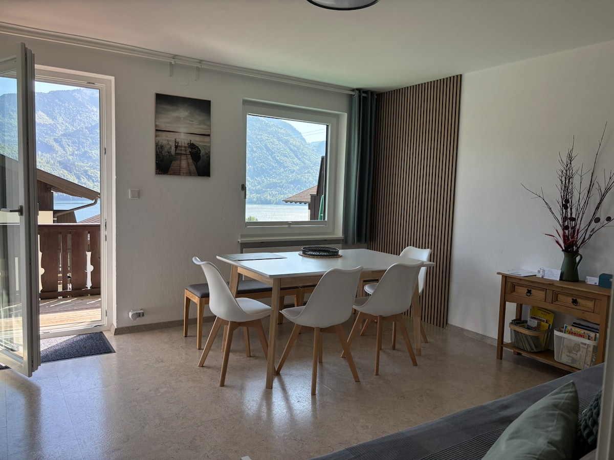 Lepo opremljen mali stan koji se nalazi na 3. spratu (bez lifta) sa pogledom na slikoviti Mondsee. Jedna dvokrevetna soba, tuš i sudoper (u spavaćoj sobi, bez odvojenog kupatila). Kuhinja za jelo sa šporetom i rernom, mali frižider (bez zamrzivača), Nespresso aparat za kafu, čajnik sa trpezarijom. Mala dnevna soba sa kaučem na razvlačenje. Napomena: samo za nepušače.