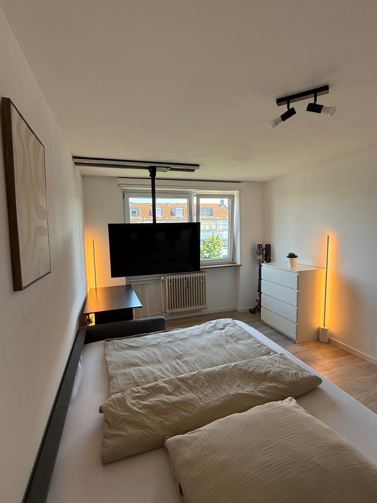 Svijetli stan od 70 m² s pogledom na Olimpijski toranj i odlična povezanost: U-Bahn i tramvaj su udaljeni nekoliko minuta. Oktoberfest je udaljen samo 10 minuta vožnje od U3. Barovi, restorani i kafići nalaze se odmah iza ugla. Stan vam nudi: • Dnevni boravak sa kaučem, trpezarijom i pametnim TV-om • Spavaća soba s udobnim bračnim krevetom • Kuhinja sa mašinom za sudove, rernom, aparatom za kafu itd. • Kupatilo sa tuš-kabinom i kadom Wi-Fi, mašina za pranje veša, kao i čista posteljina i peškiri su uključeni