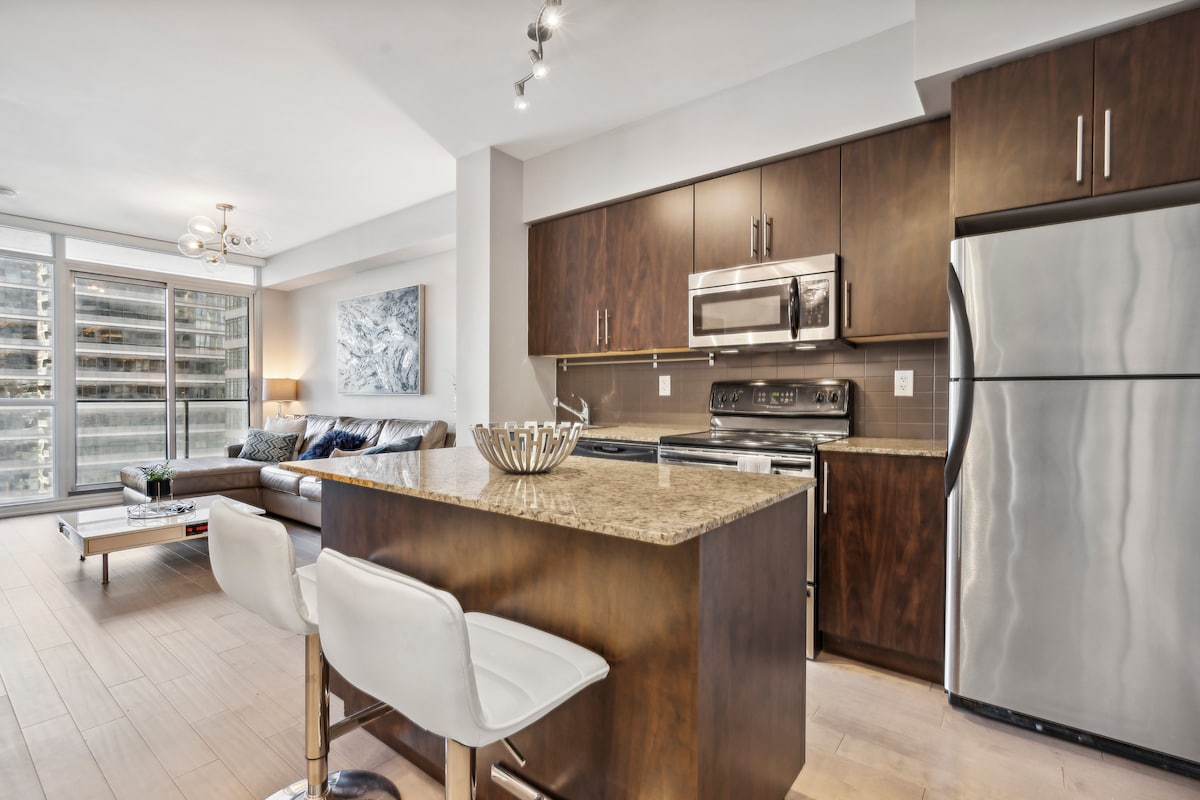Uživajte u našem luksuznom stanu u butik stilu u živopisnom gradu u centru grada. Pored glavne koncertne dvorane Scotiabank Arena, banaka, prodavnica alkoholnih pića i supermarketa, sportskih barova i restorana. Pristupite cijelom gradu stazama od zgrade do stanice Union. Do CN tornja se stiže peške! Dizajnerske završne obrade za razliku od bilo čega u okolini. Besplatne usluge konsijerža koje pruža poseban tim za upravljanje objektima - obilasci, noćni život, restauracija, usluge privatnog kuvara i još mnogo toga!