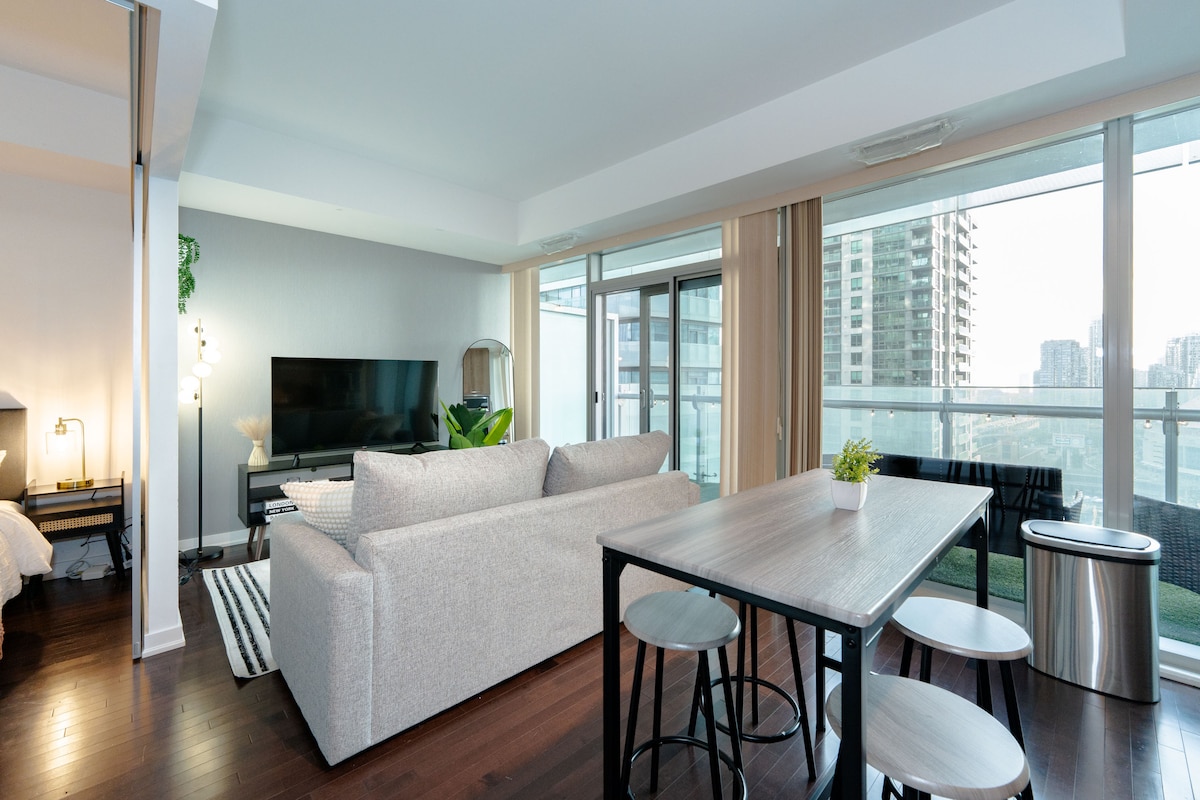 Idealno za jednog ili dva gosta - goste koji putuju sami, parove, prijatelje ili one koji su u gradu zbog posla. Žurke i dodatni gosti nisu dozvoljeni. Uživajte u pogledu sa velikog balkona sa sjajnim pogledom na CN toranj, jezero Ontario i horizont Toronta! Nalazi se pored stanice Union, što gostima olakšava dolazak i odlazak. Blizu svih oblika prevoza. Kratka šetnja do CN tornja, Harborfronta, sportskih/koncertnih dvorana, Zabavnog okruga, restorana i prodavnica. Pročitajte odjeljak s pravilima u potpunosti!