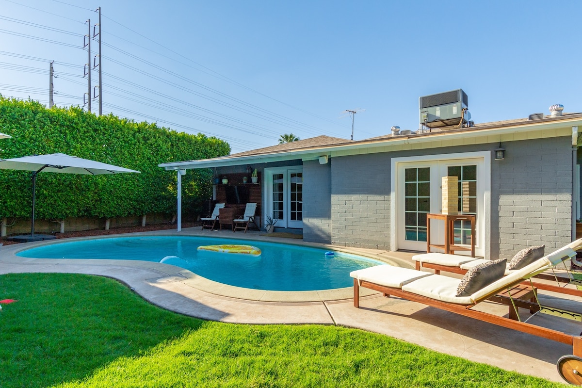 Opustite se u privatnosti u ovom modernom smještaju sa 4 spavaće sobe i 2 kupatila u Starom gradu Skotsdejla. Okružen bujnim stablima fikusa, ima bazen (sa dodatnim grijanjem), đakuzi, natkriveno dvorište sa TV-om, Wi-Fi zvučnicima, roštilj i igre na otvorenom kao što su Dženga i kukuruzna rupa. Uživajte u potpuno opremljenom kafiću i živopisnom uređenju. Nekoliko minuta od glavnih atrakcija, ovo mirno utočište nudi i mir i praktičnost za nezaboravan boravak. Rezervišite sada i doživite najbolje od Skotsdejla!