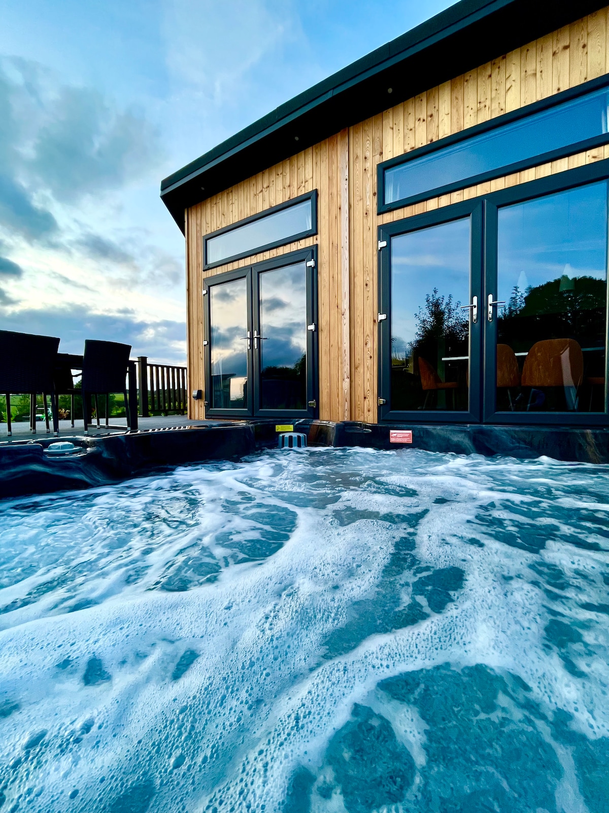 Ručno izrađena brvnara, postavljena sama u Vaj Veli AONB, Vels. Tradicionalni karakter, zajedno sa mnoštvom moderne udobnosti. Otvoreni dnevni boravci, 2 spavaće sobe i kupatilo. Udobno spava 4-6 osoba. Potpuno opremljena kuhinja sa mašinom za pranje sudova i mašinom za topla pića. Vatra koja gori klada. Smart TV. Besplatan Wi-Fi. Posteljina, luksuzni peškiri i ogrtači za kupanje. Paket dobrodošlice, uključujući Prosecco. Velika hidromasažna kada na drva, potopljena u terasu na balkonu. Terasa sa nameštajem. Posuda za vatru sa roštiljem. Niz divljih životinja.