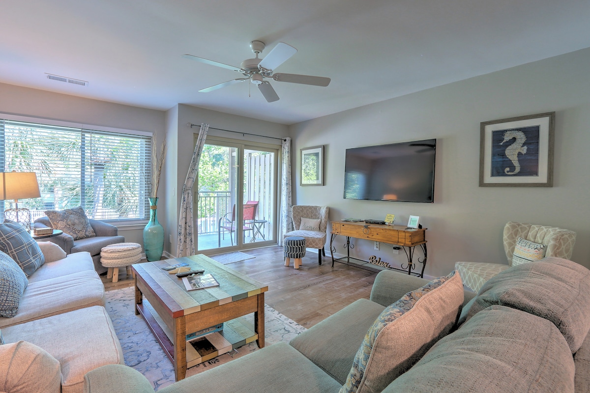 🌊 🌴 Lokacija, lokacija, odmor! Dobro došli u svoj odmor iz snova u Bluf vilama, gdje je sve što volite u Hilton Hedu udaljeno samo nekoliko koraka. Ovaj sunčani i prostrani kondominijum sa 2 spavaće sobe i 2 kupatila nalazi se na svega nekoliko minuta hoda od plaže, marine South Beach, legendarnog kafića Salty Dog i bazena South Beach (ponovno otvaranje ljeta 2025)! Opustite se na privatnom dvorištu s pogledom na Bredok Kouv, opustite se u obnovljenom stambenom prostoru ili prošetajte i uživajte u sladoledu pored luke.