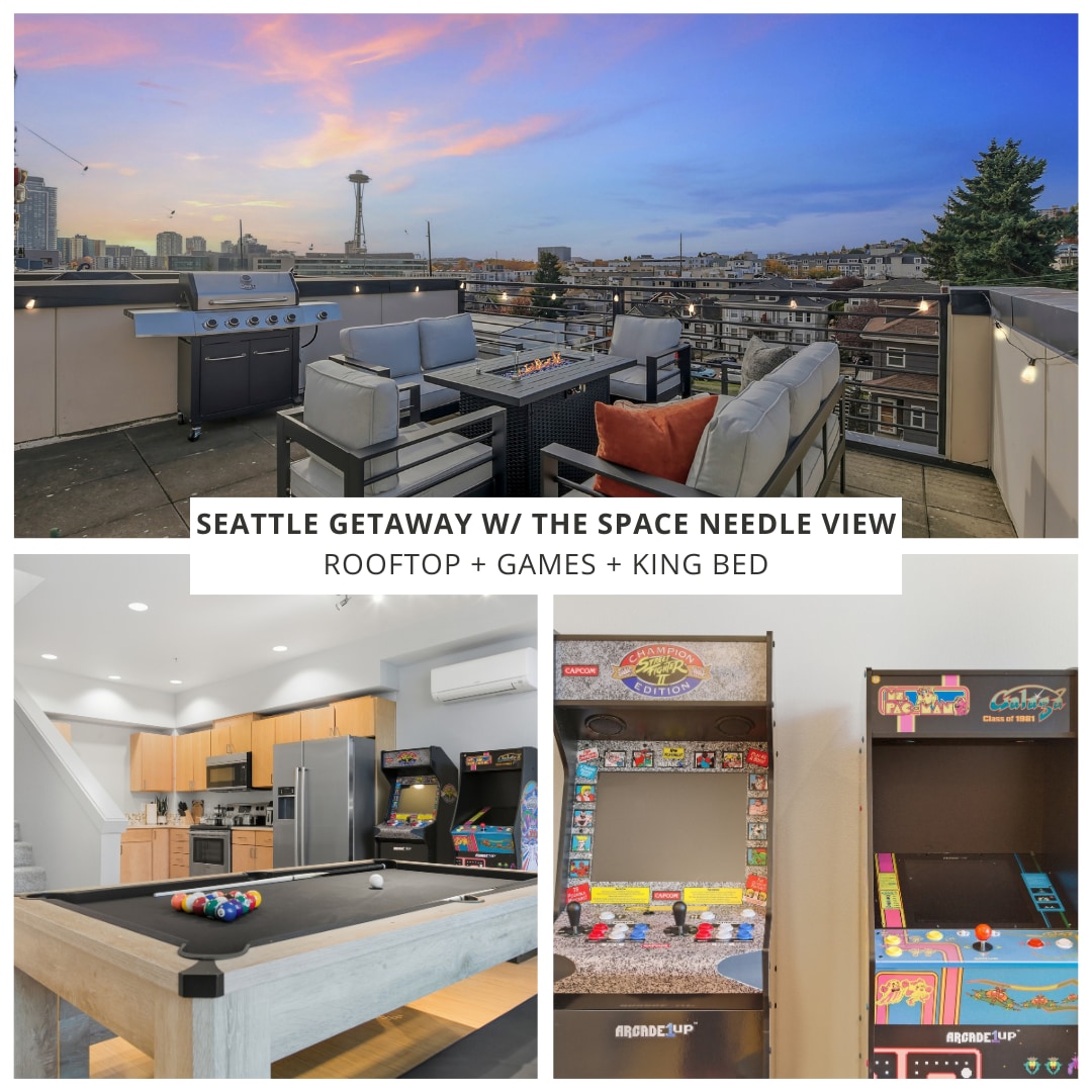 A lower Queen Anne townhouse with a stunning 180° view of downtown Seattle and ocean. Blocks away from Seattle Center, Climate Pledge Arena and walking distance to many iconic destinations. Take rails to T-Mobile Park, Lumen Field. This two bedroom w/ AC offers a modern yet comfy home feel. Rooftop views of the skyline during sunrise and sunset are unbelievable. Heaters in rooftop. We offer an abundance of household supplies (the more the merrier!). Offer early drop off bags. Please ask.