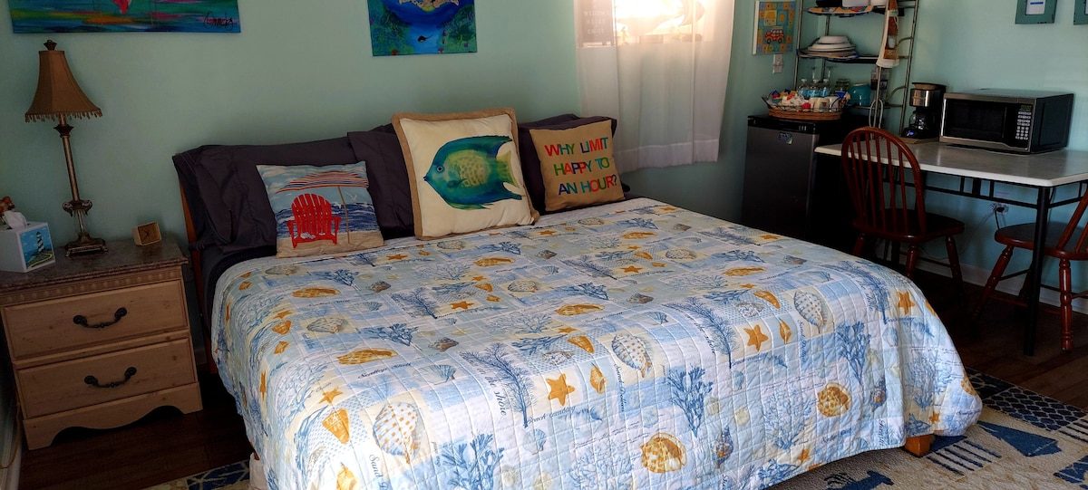Space for 2. Private studio, private entrance, parking in front. No smoking in studio. Big private shower w/softner, removable head, KING bed,color tv , cable ,wifi. Table big enough to be used for business, microwave, coffee maker, toaster, fridge, dresser, chest w/hanging storage and linens supplied. There is a sitting area outfront to smoke and relax. Added AC/Heater unit installed along with our main house standard central system unit for added comfort controlled by you